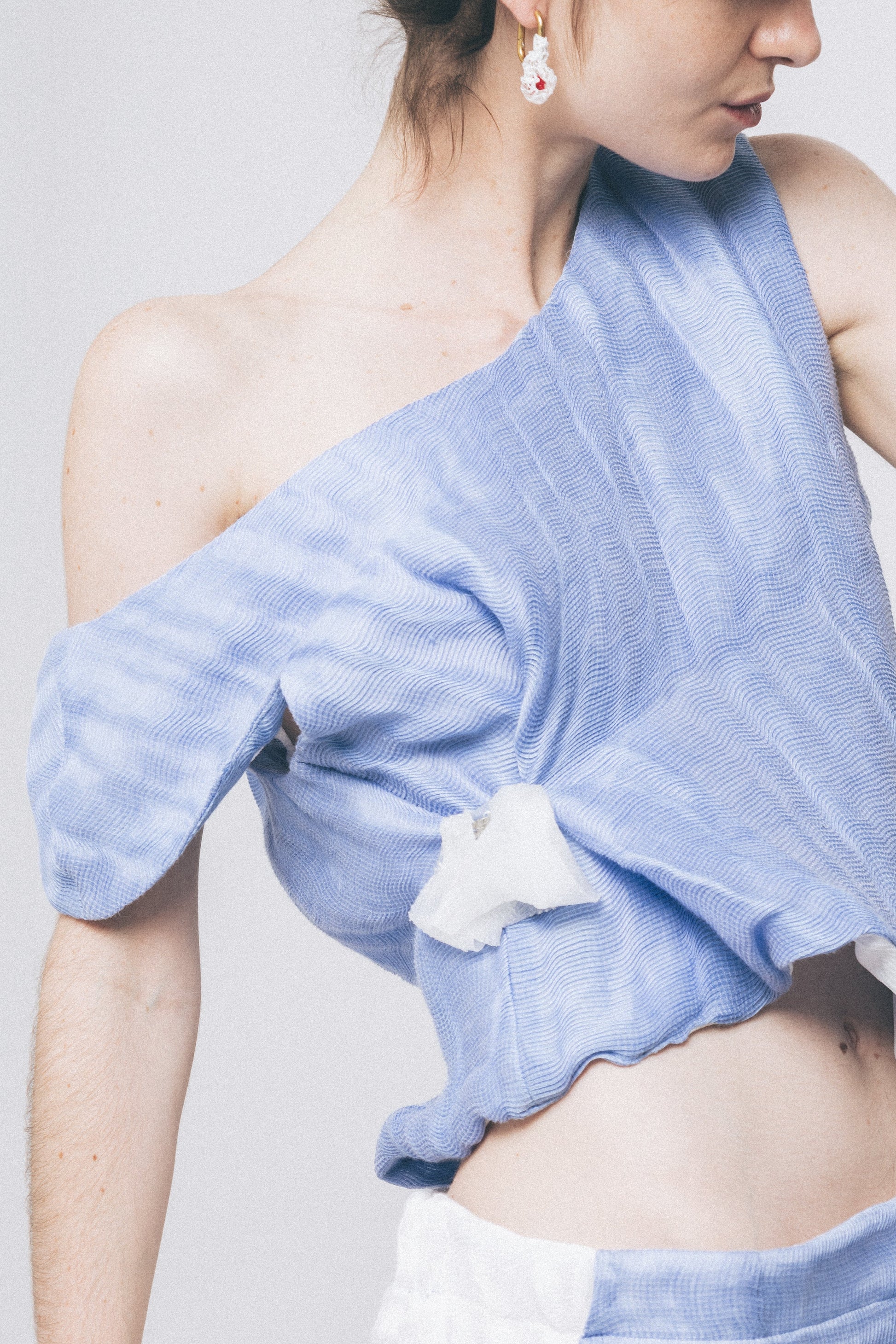 Handcrafted brooch in molded fabric, with a blue/white finish and an organic shape. A metal clasp and LIPPER plate complete the piece with solidity and detail.