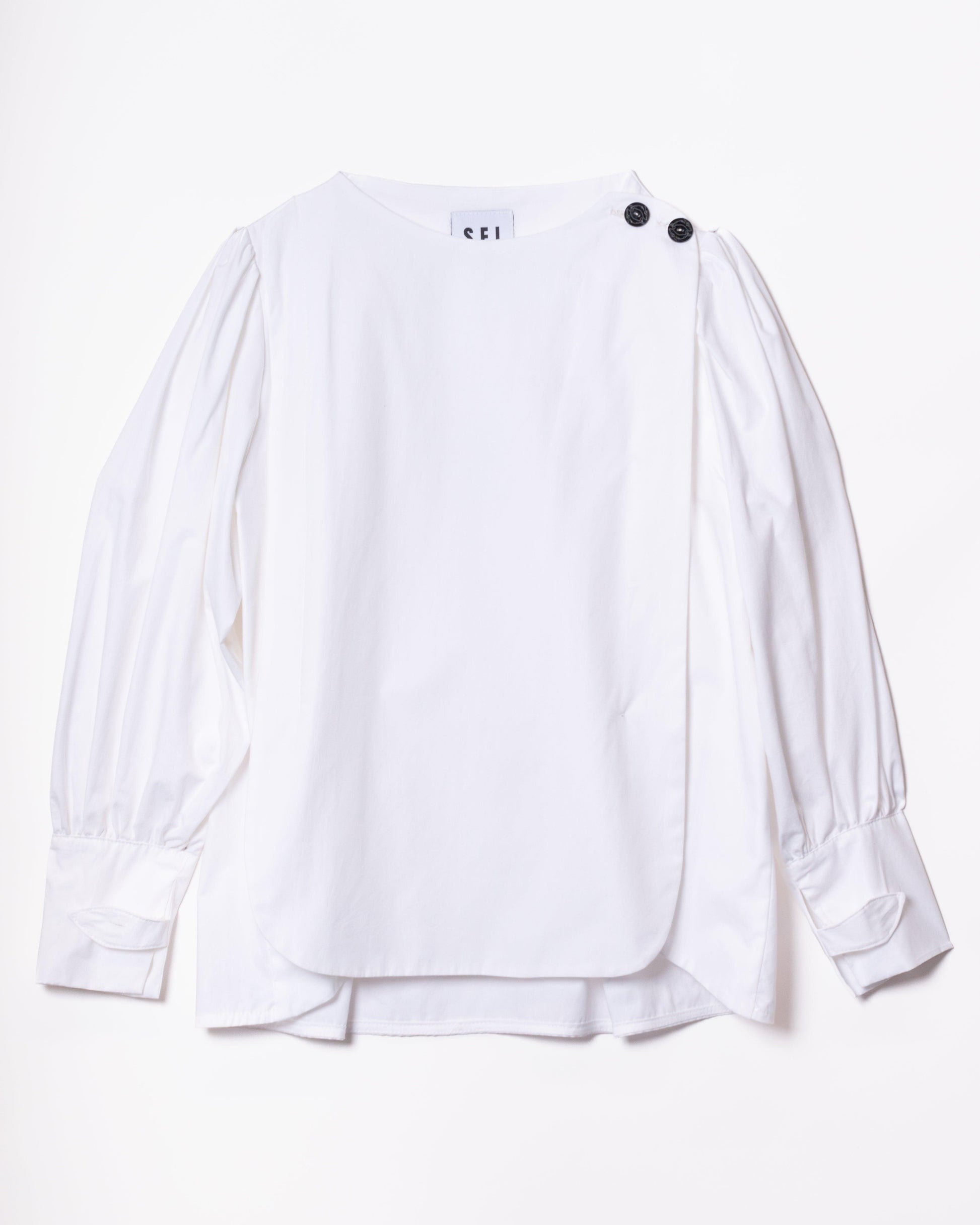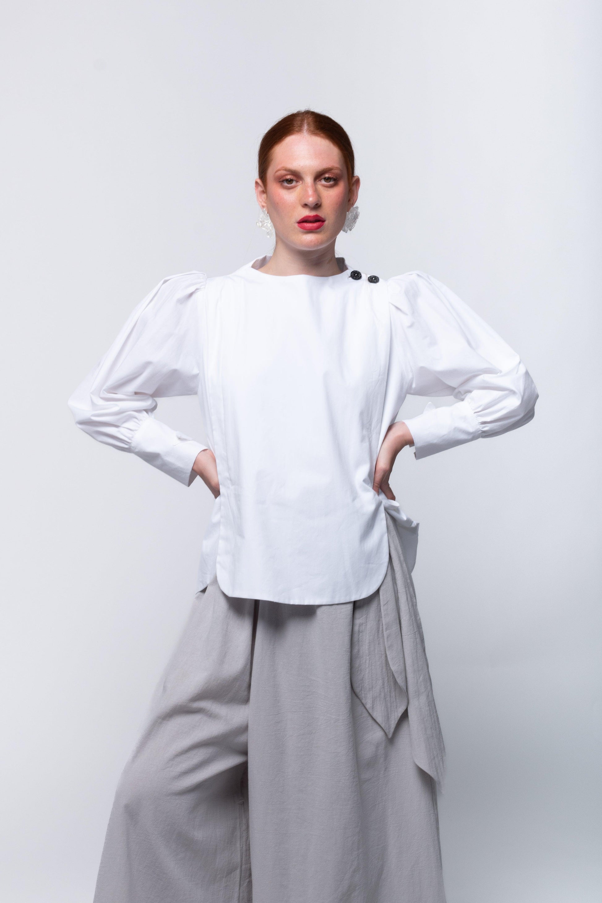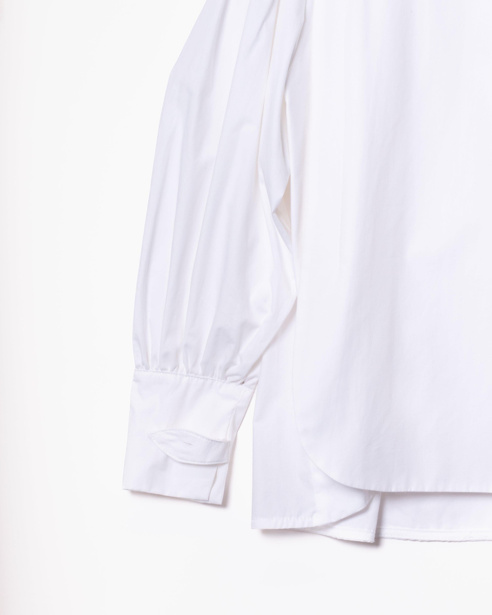 Camisa con paneles laterales redondeados que ocultan los botones de un lateral de la camisa. Cuello perkins y espalda con canesú. Espalda suelta, con pliegues anchos en la espalda. Mangas globo con sisas bajas. Puños tipo esmoquin abrochados con dos tiras del mismo tejido, con lazada.