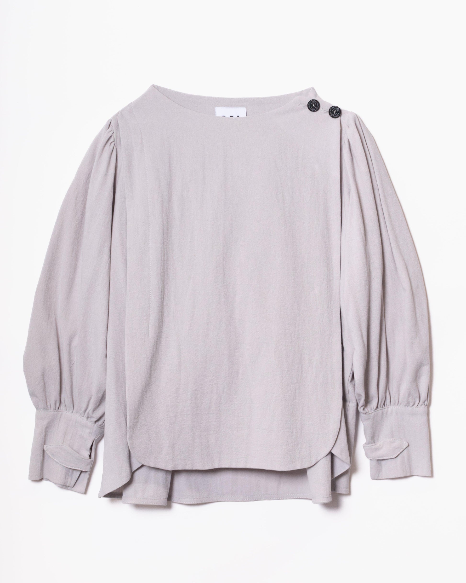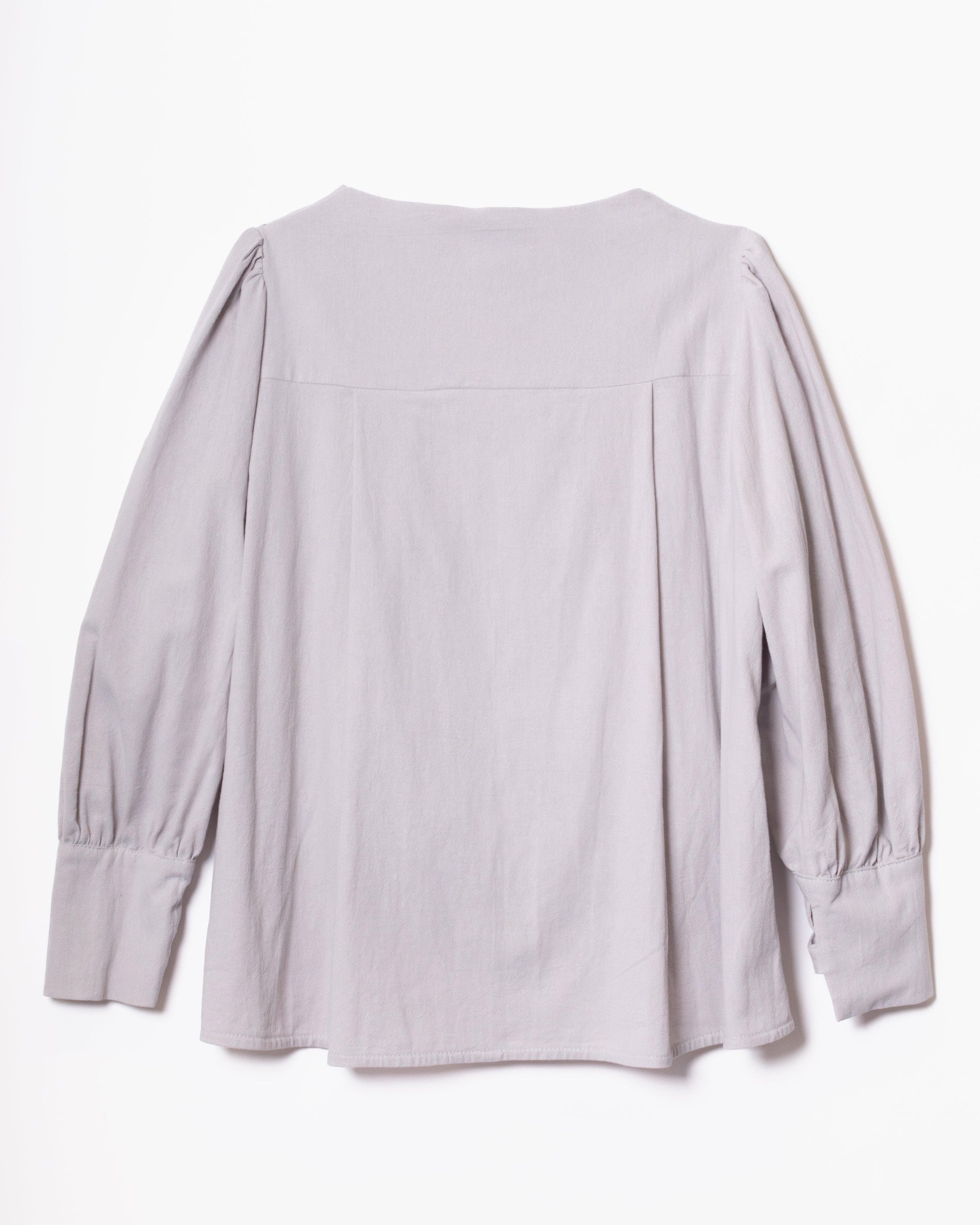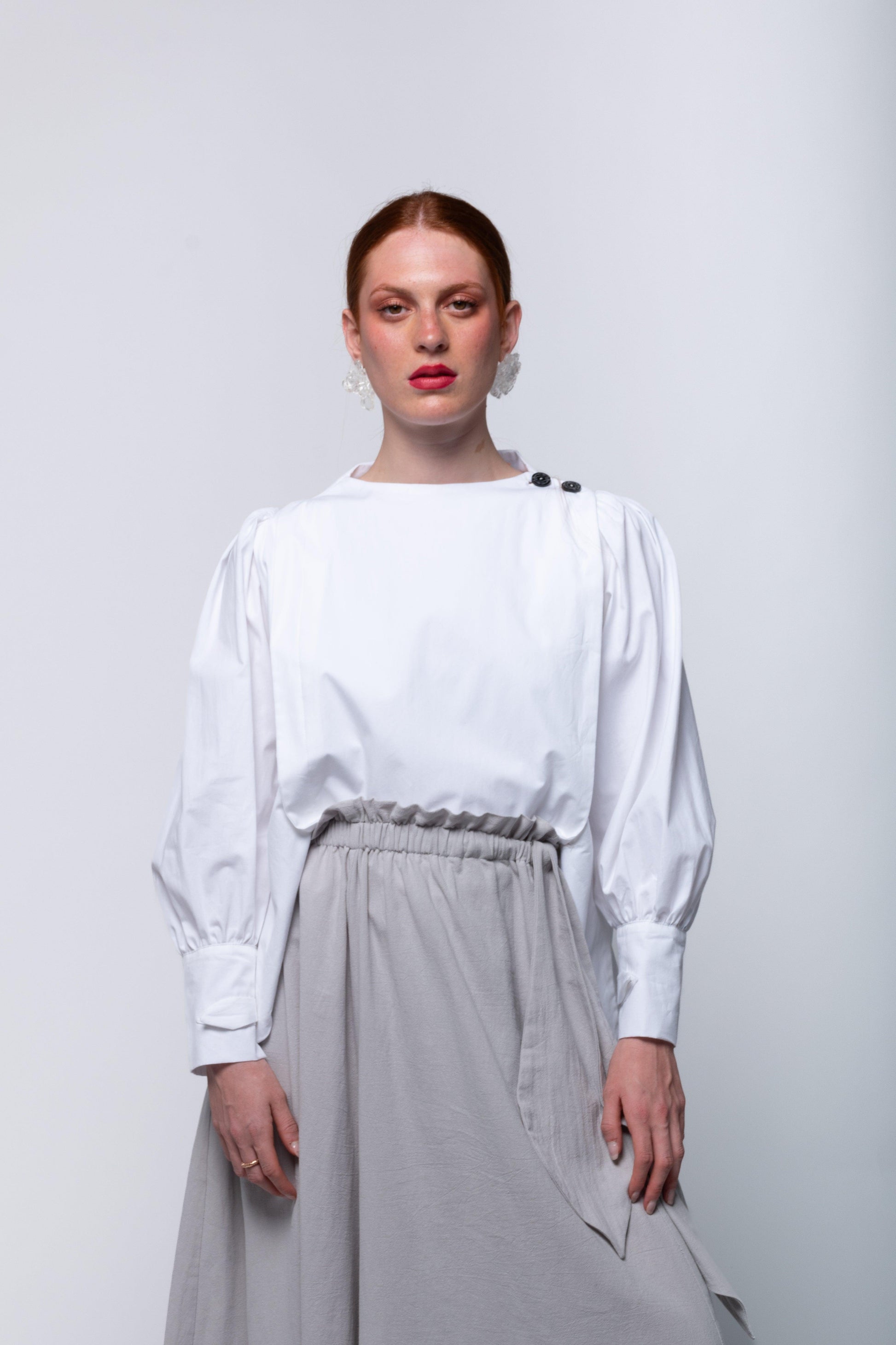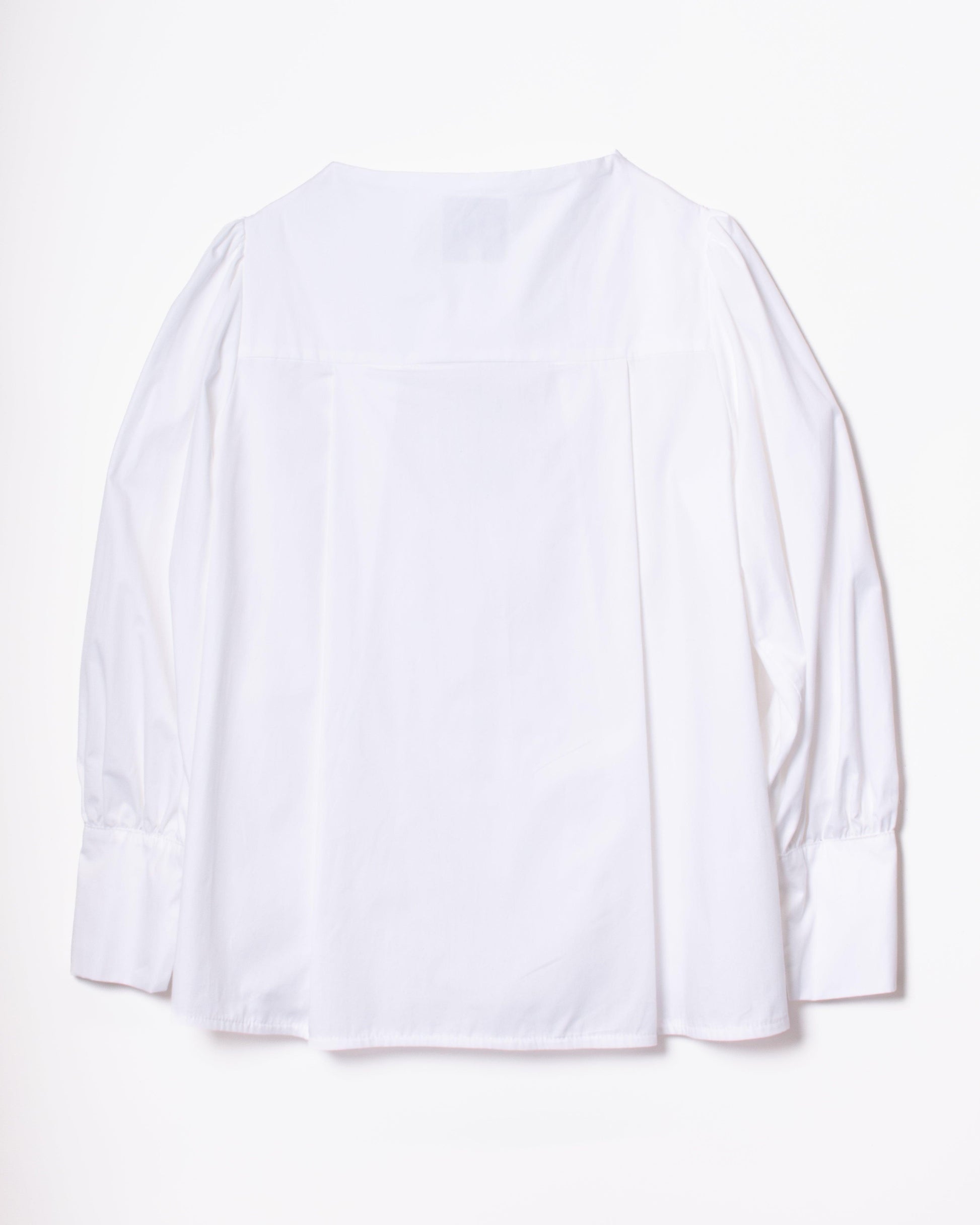 Camisa con paneles laterales redondeados que ocultan los botones de un lateral de la camisa. Cuello perkins y espalda con canesú. Espalda suelta, con pliegues anchos en la espalda. Mangas globo con sisas bajas. Puños tipo esmoquin abrochados con dos tiras del mismo tejido, con lazada.
