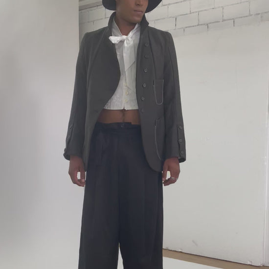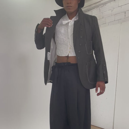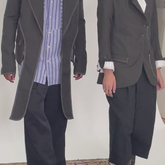 Chaqueta inspiración sastre, con botonadura en centro superior delantero y asimetrías en los bolsillos, con pespunte a 0,7 cm alrededor de los bolsillos. Botonadura en centro espalda. Abertura doble en manga, hoja alta y hoja baja.