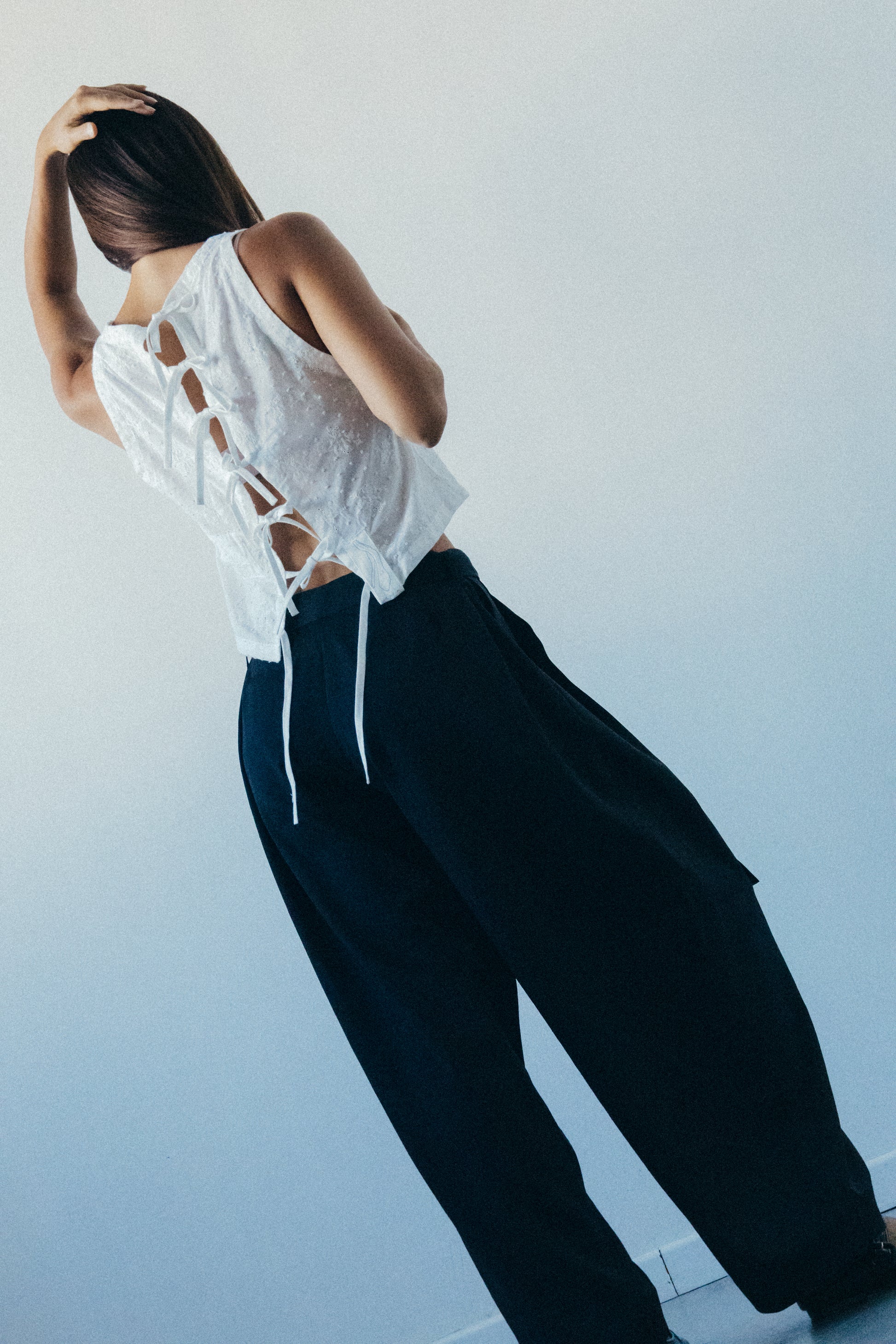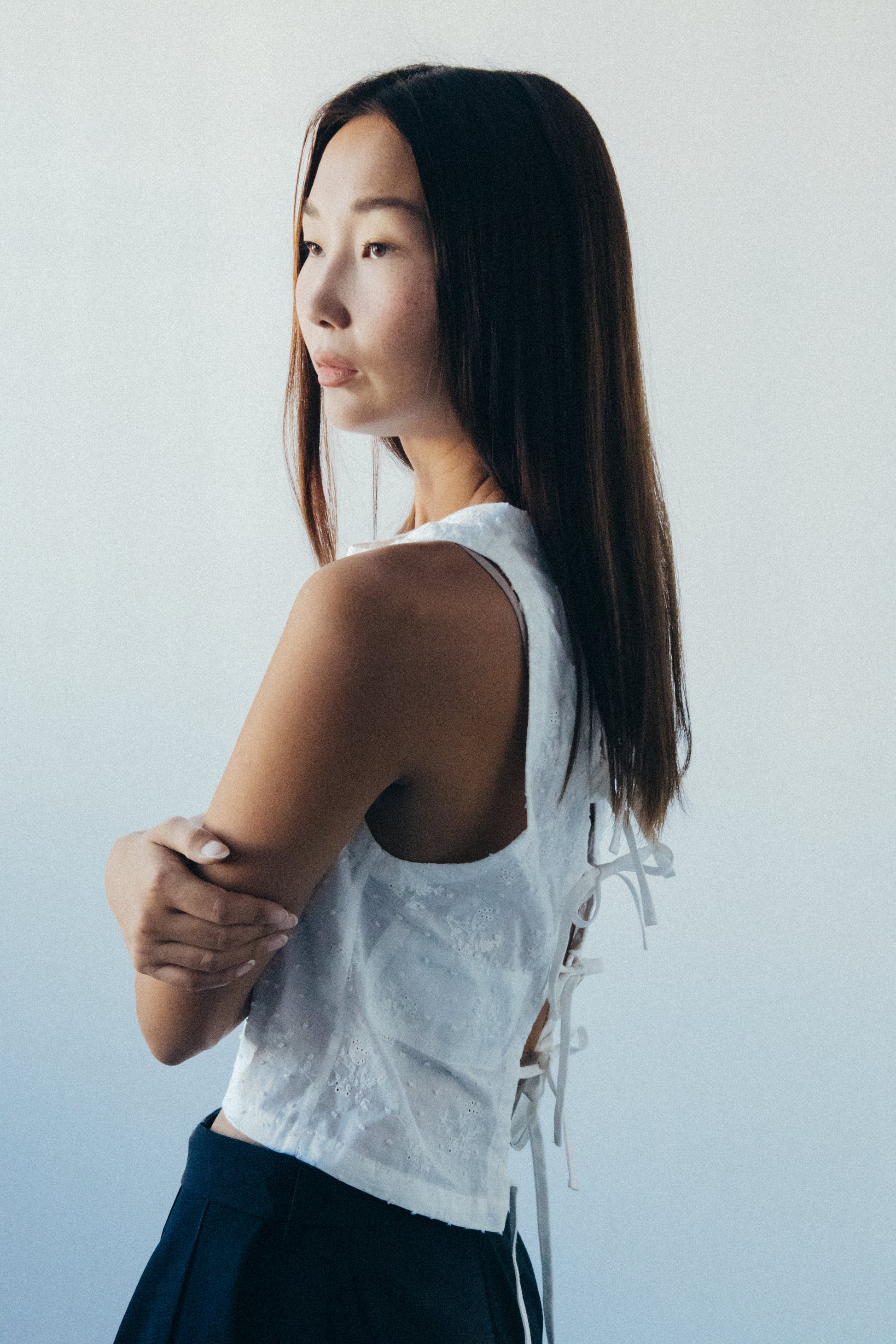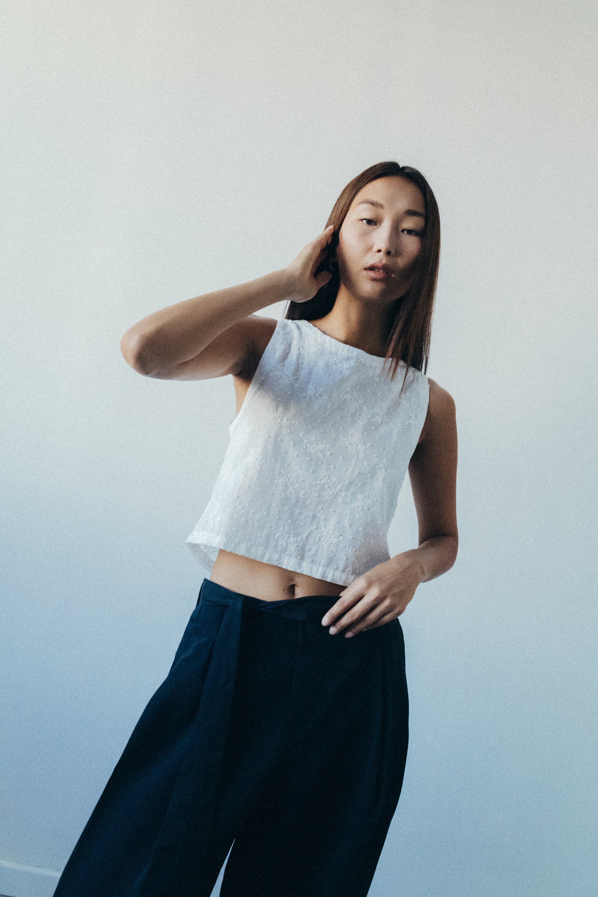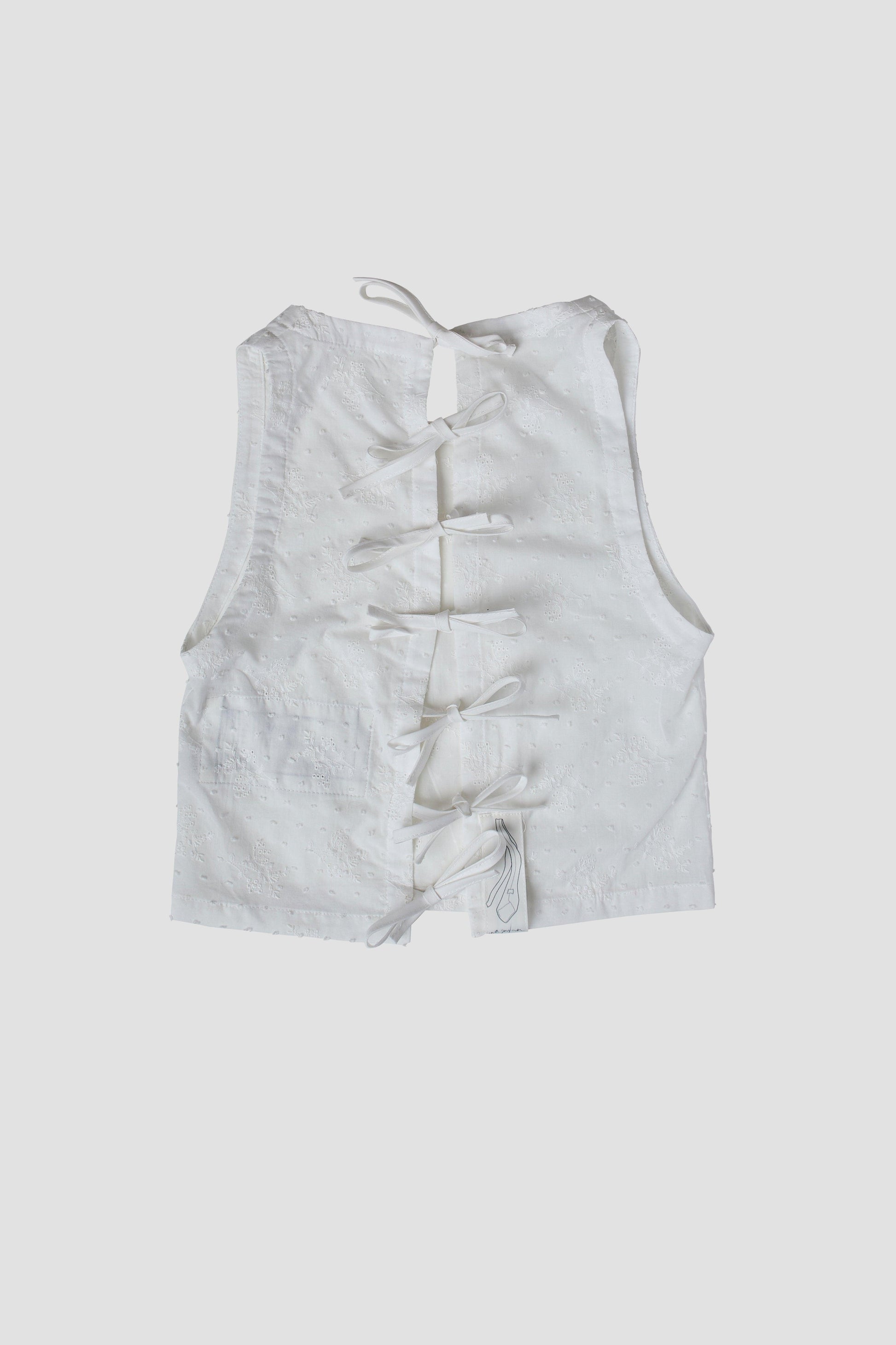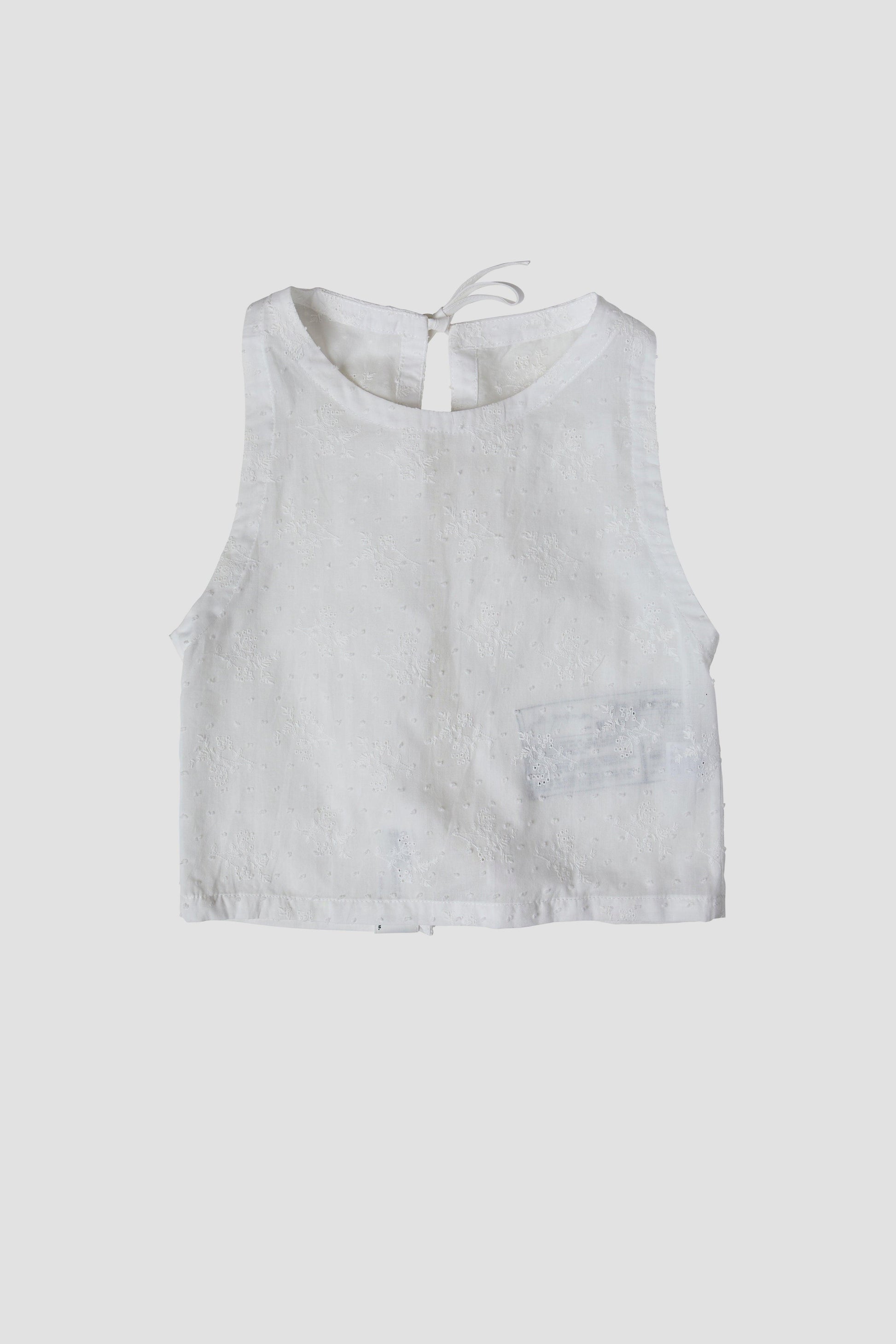Top blanco bordado sin mangas, con cuello redondo y abertura en la espalda.