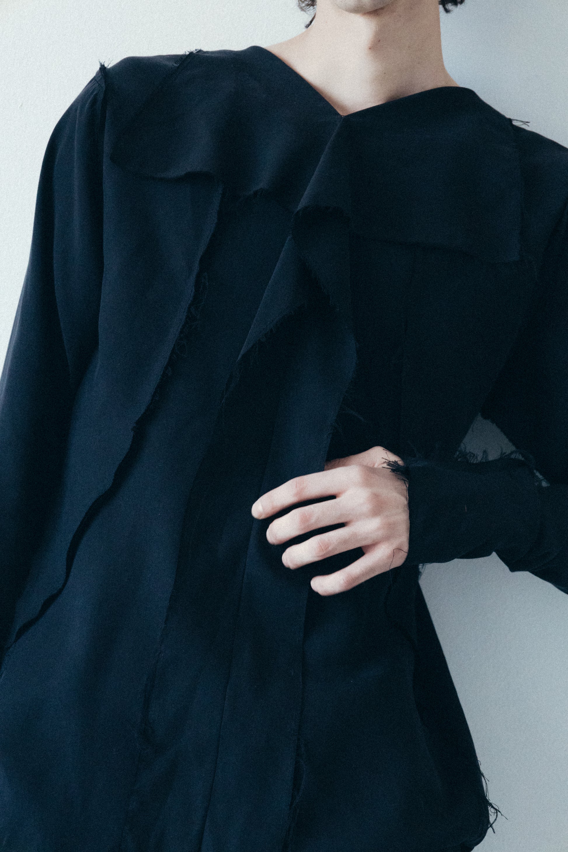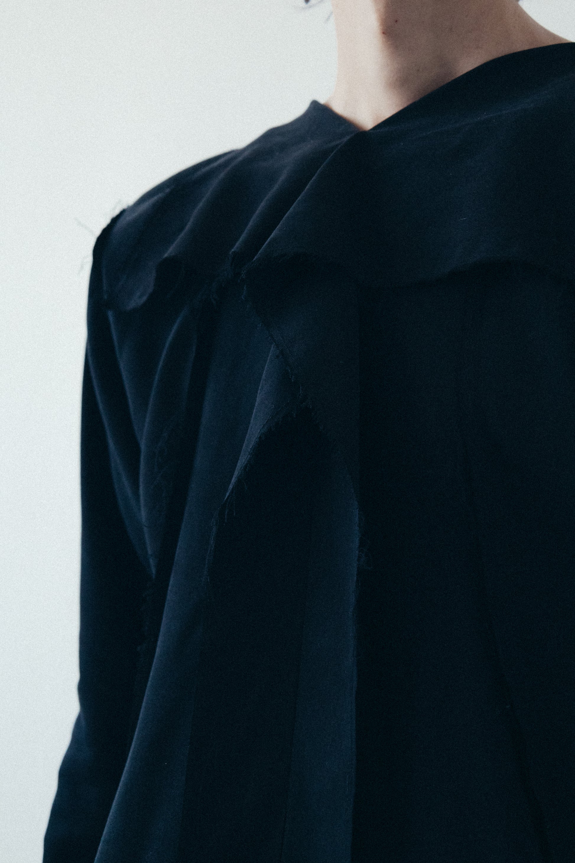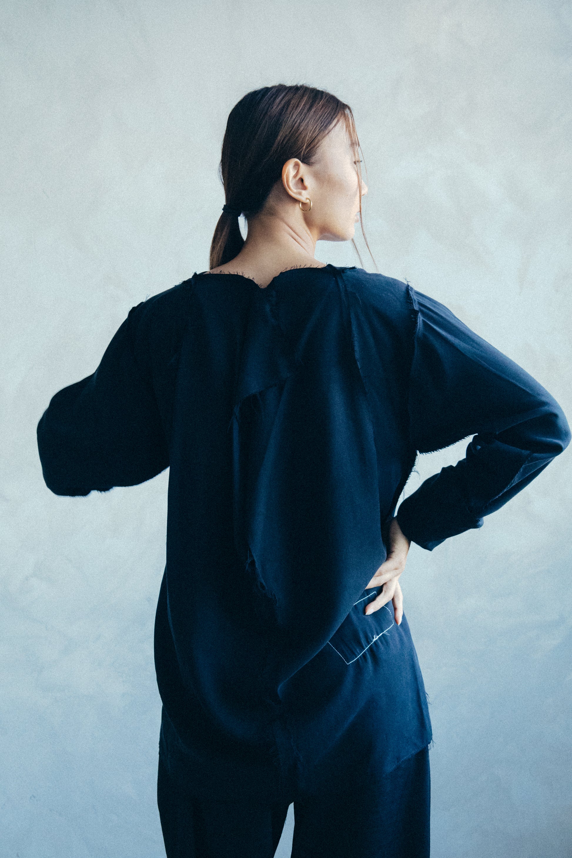 Blusa de manga larga con cuello solapado en centro delantero. Detalle de costuras hacia fuera en toda la prenda.