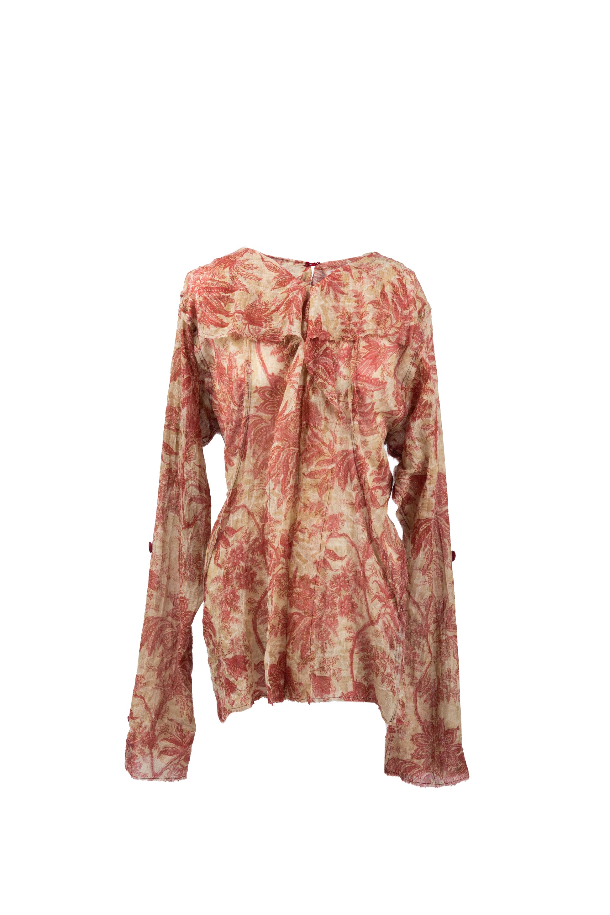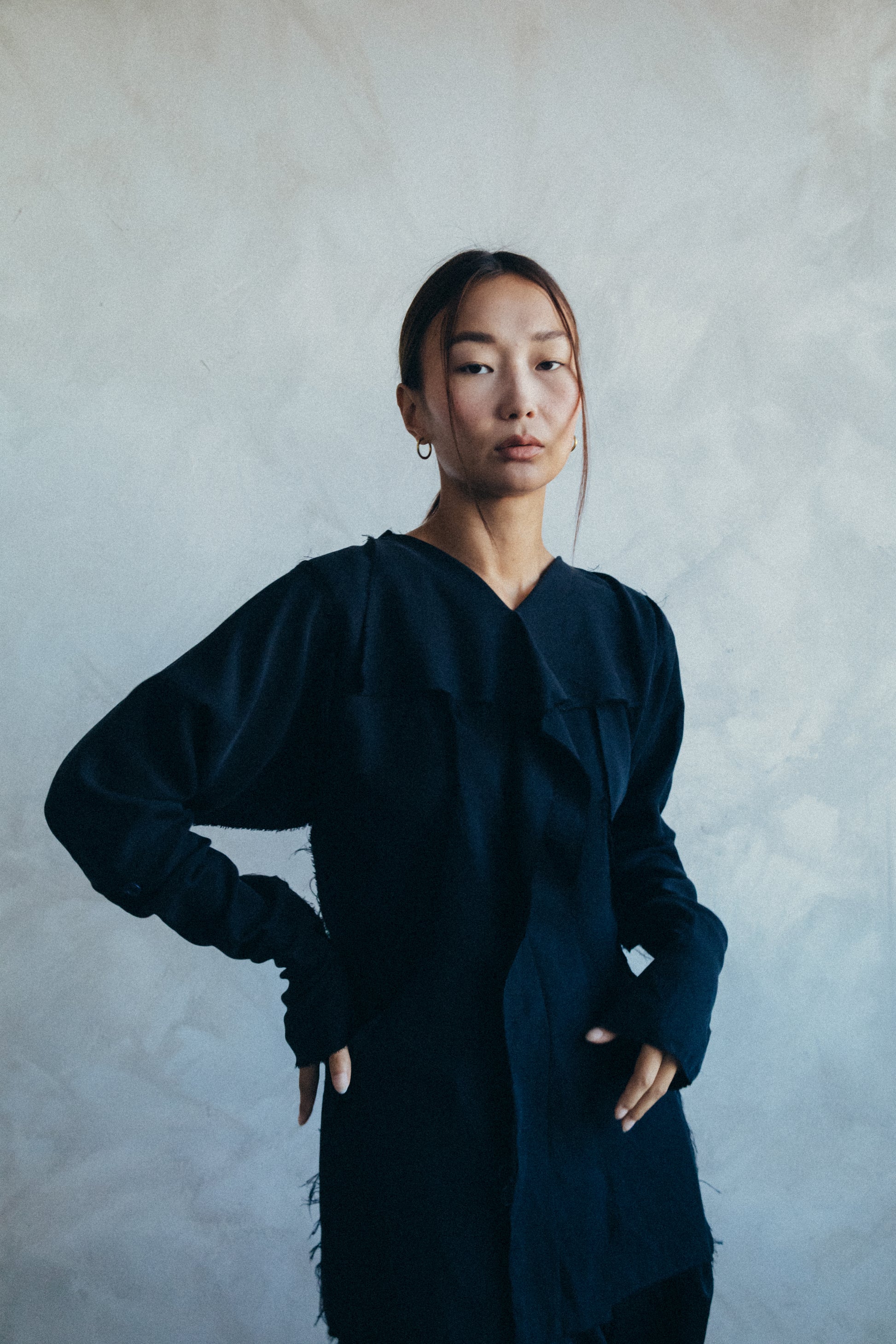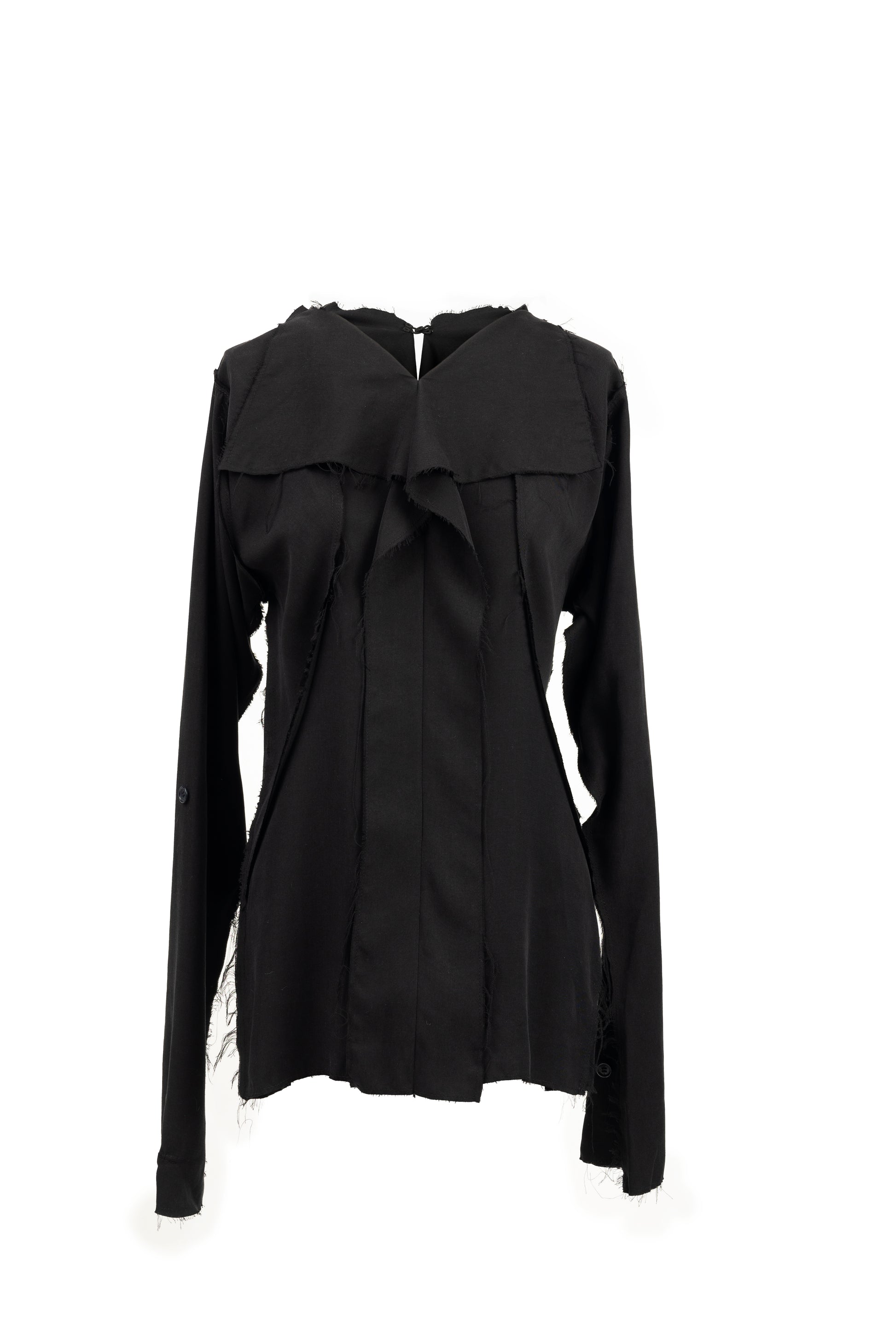 Blusa de manga larga con cuello solapado en centro delantero. Detalle de costuras hacia fuera en toda la prenda.