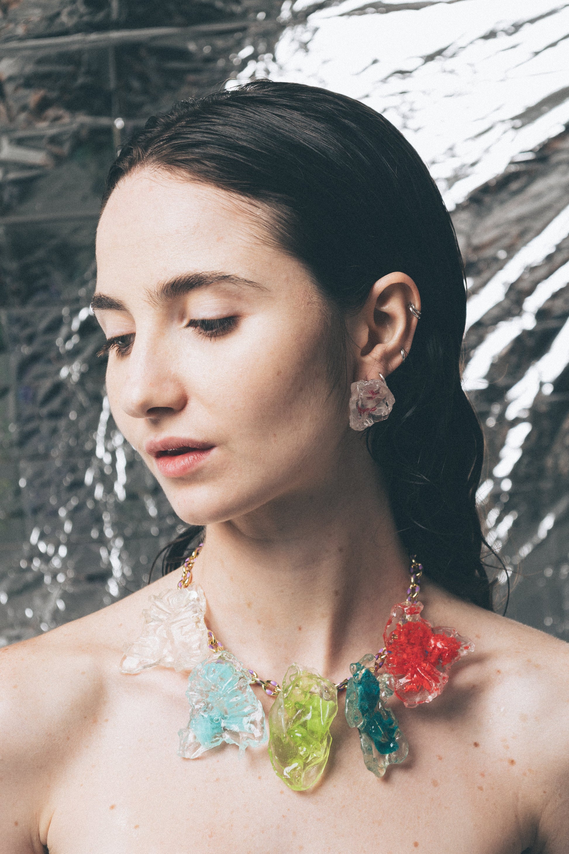 This design allows the wearer to reposition the charms, offering multiple styling possibilities and a playful, personal touch. Made with 100% E-POXI resin, it combines artisanal craftsmanship with contemporary innovation. Length: 42 mm.