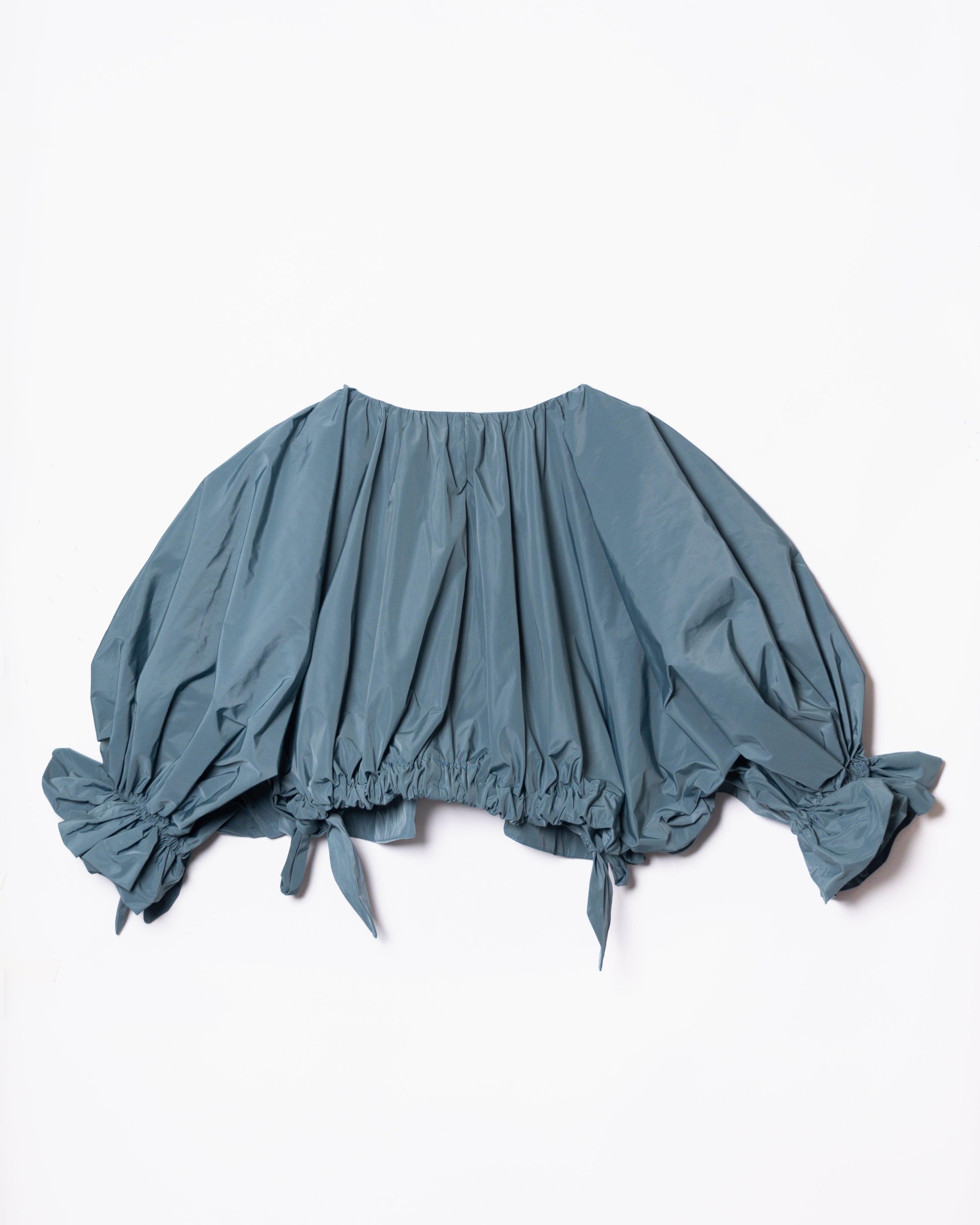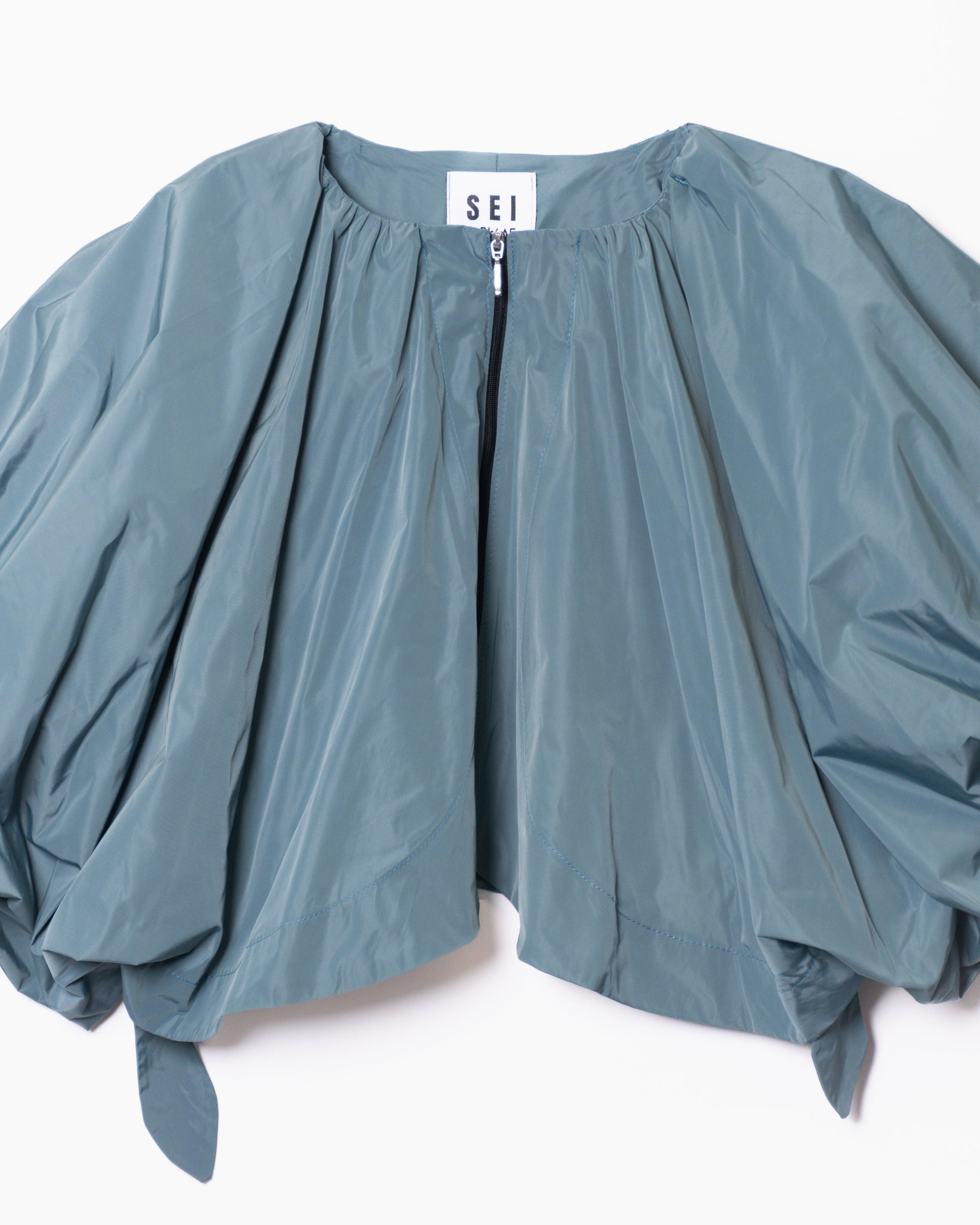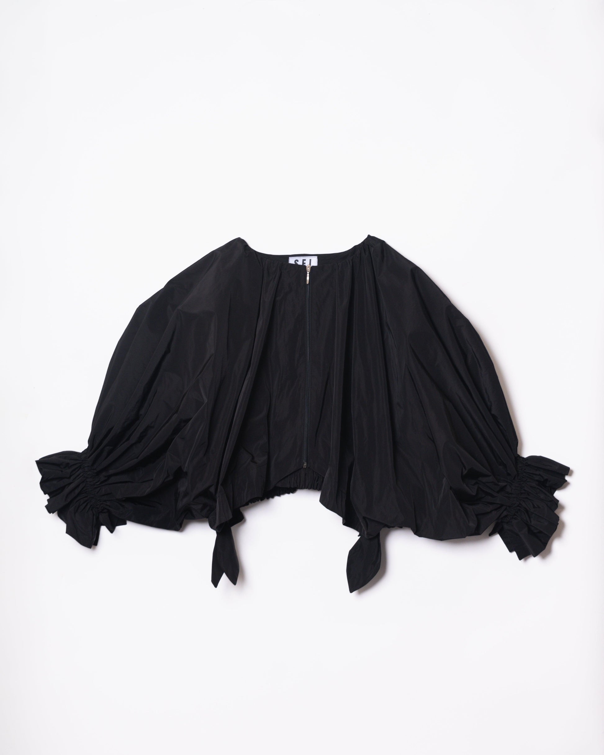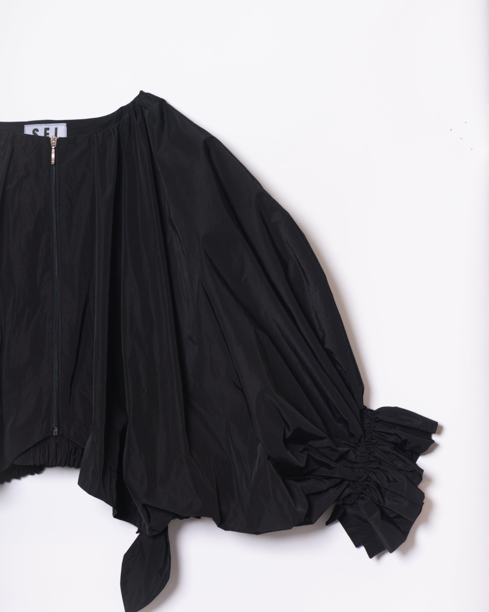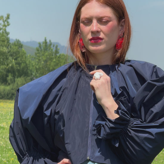 Superimposed garment, as an independent piece of the SEI base coat. The sleeves have great volume so much that they cover the entire front, raglan type. Central closure to be analyzed if using 3 loops of the same fabric or zipper. Balloon back hem with gathered elastic. Rubber on the cuff, generating a small 4cm ruffle, gathered so that it lies on the sleeve of the coat.