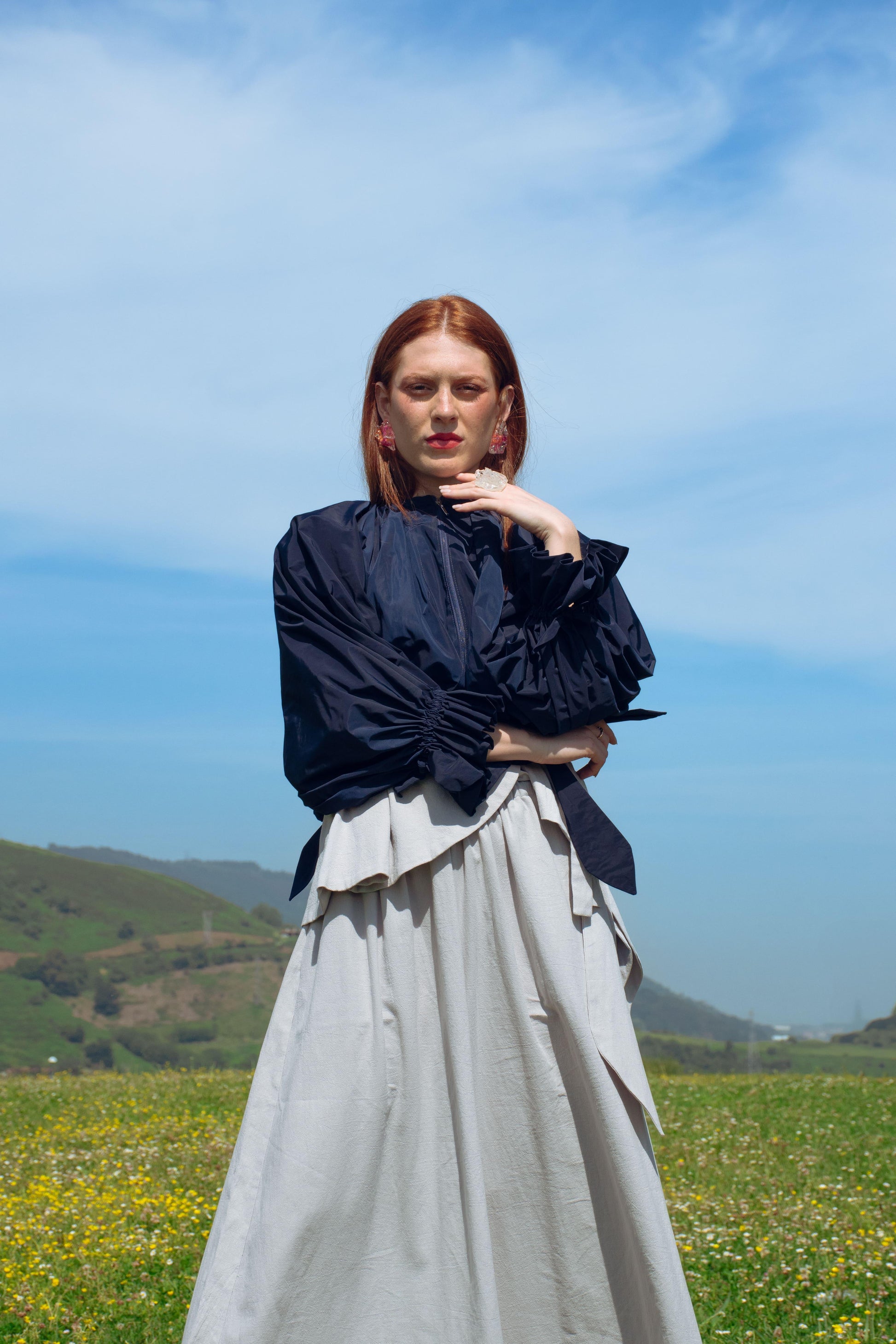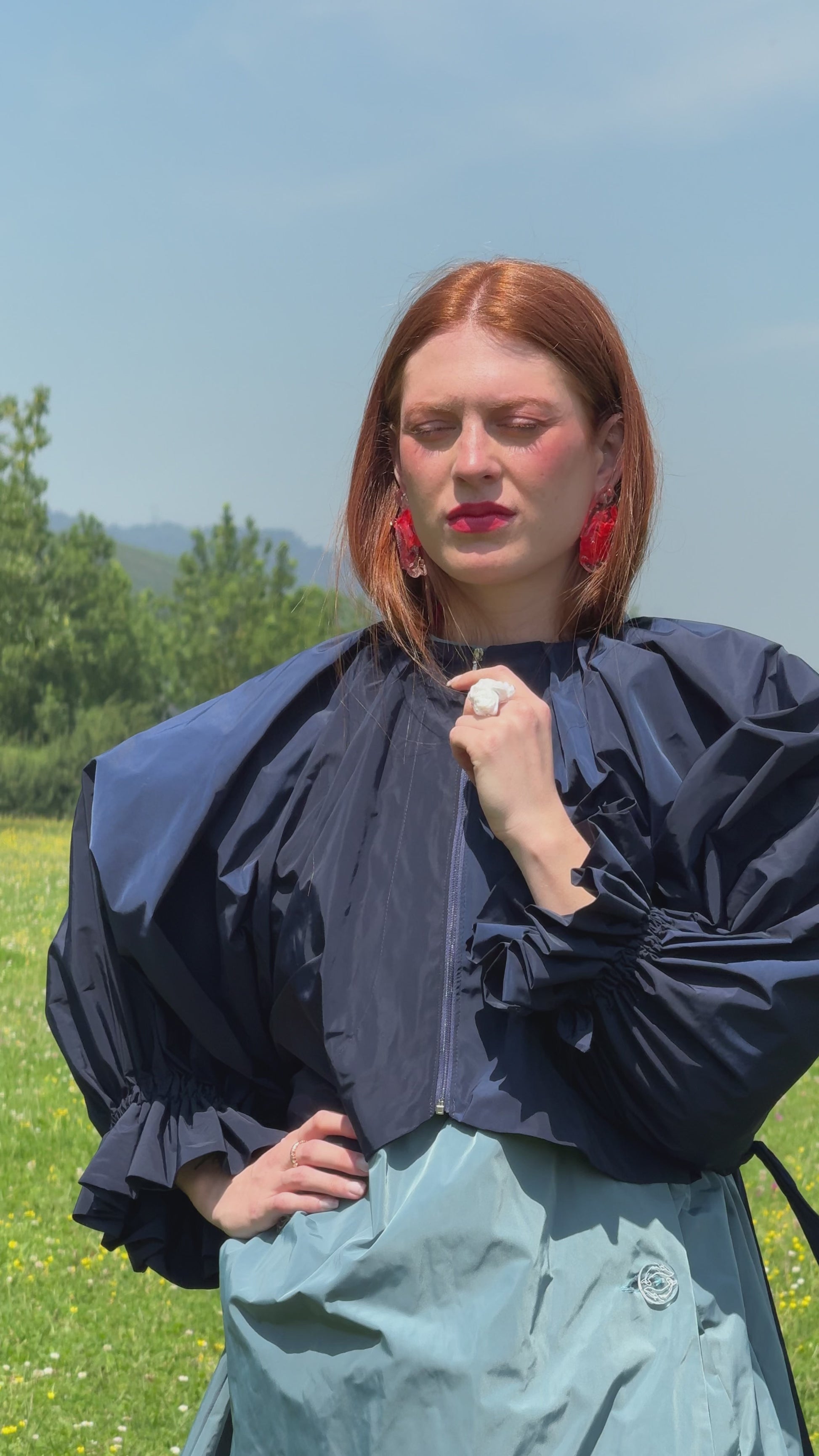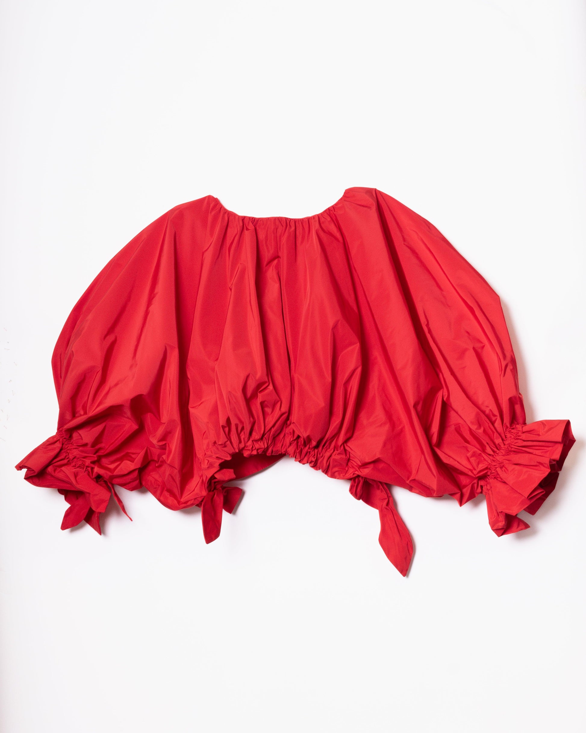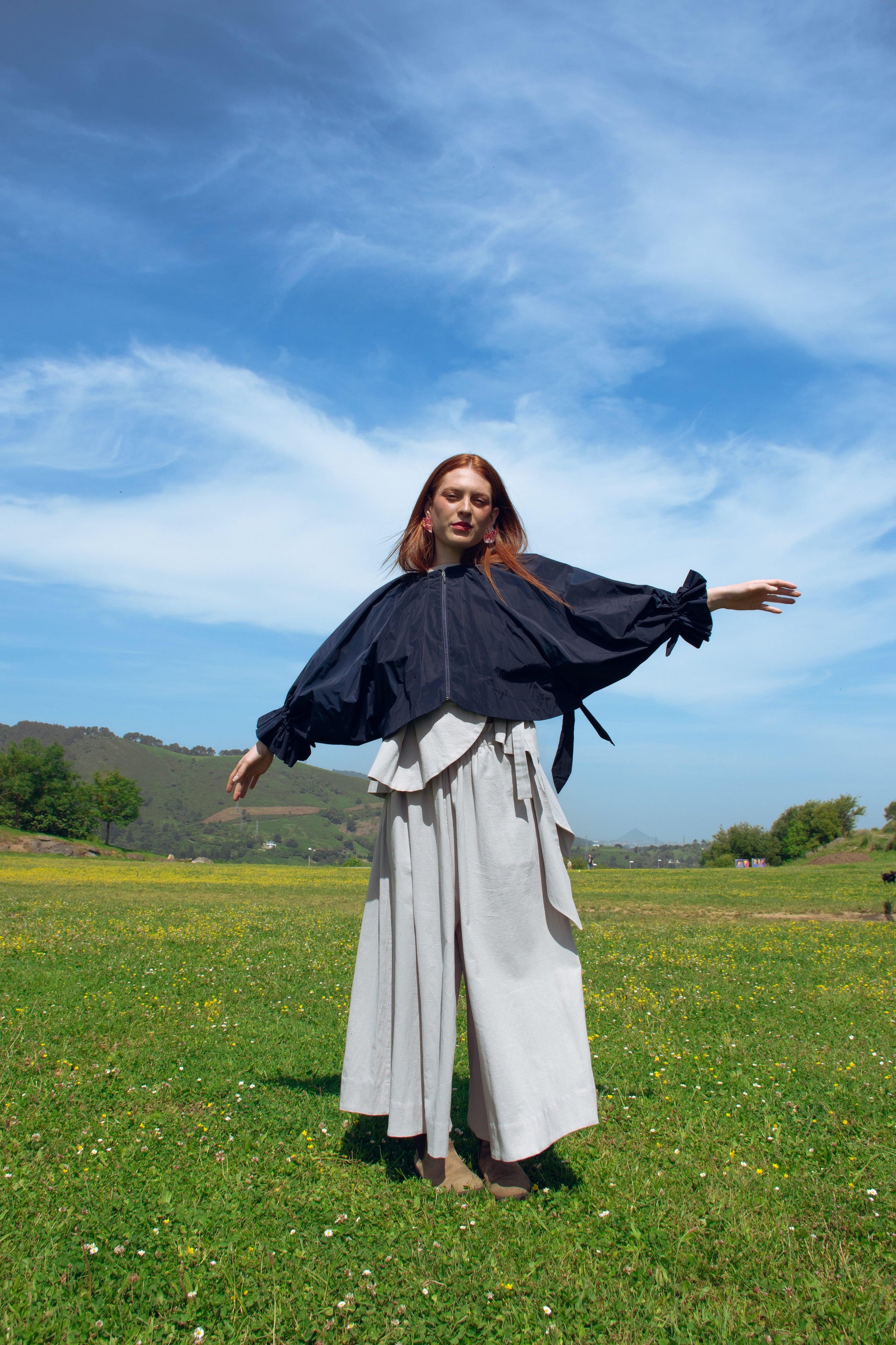 Superimposed garment, as an independent piece of the SEI base coat. The sleeves have great volume so much that they cover the entire front, raglan type. Central closure to be analyzed if using 3 loops of the same fabric or zipper. Balloon back hem with gathered elastic. Rubber on the cuff, generating a small 4cm ruffle, gathered so that it lies on the sleeve of the coat.