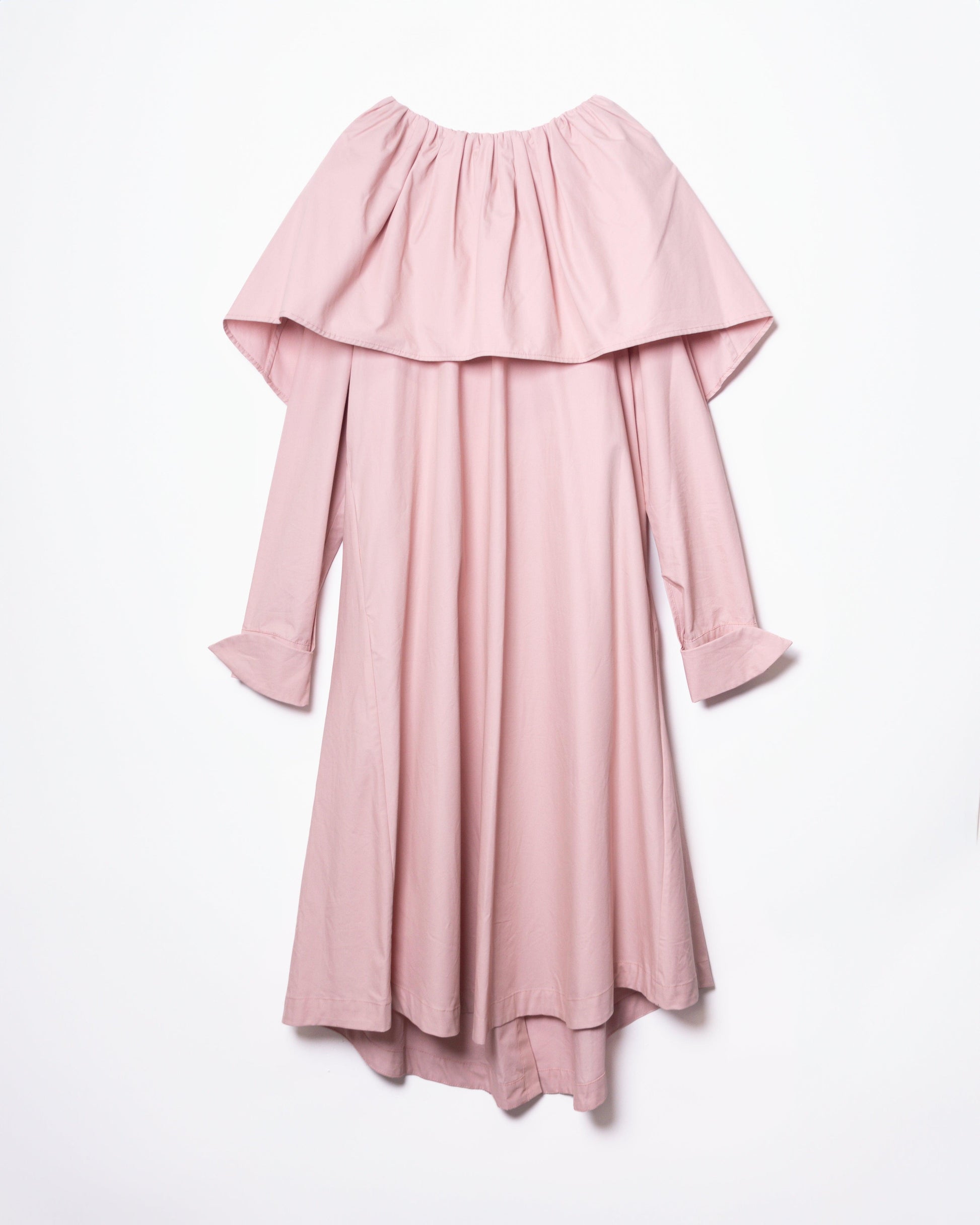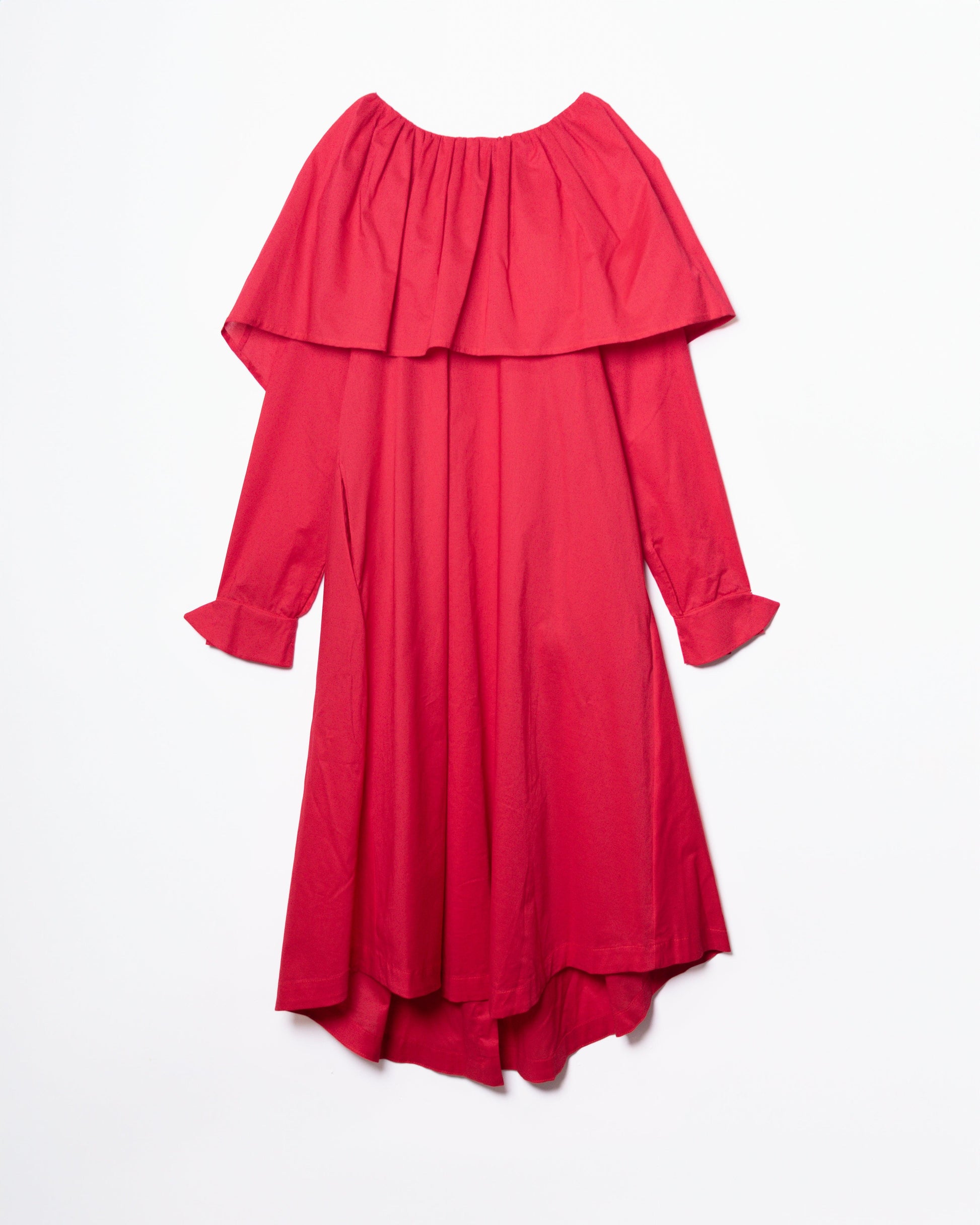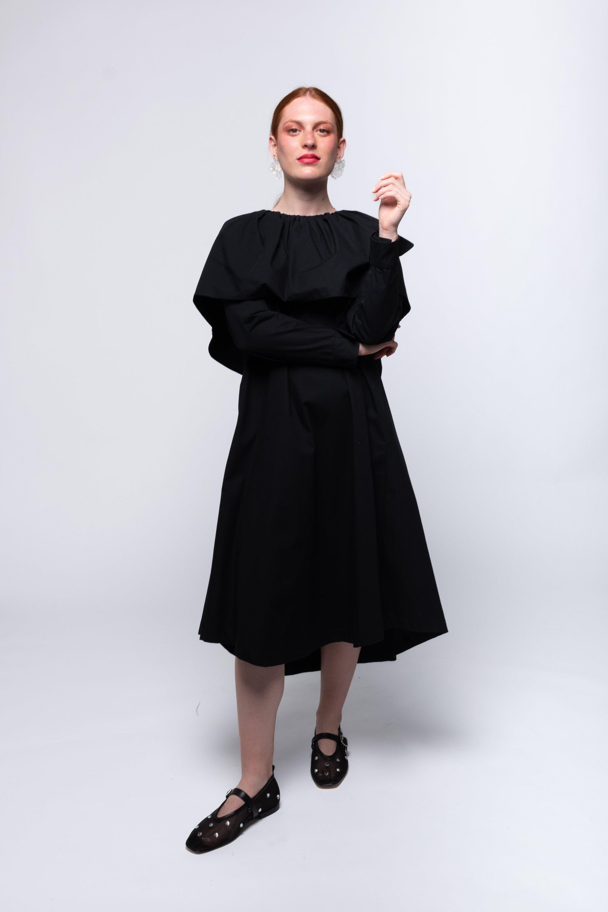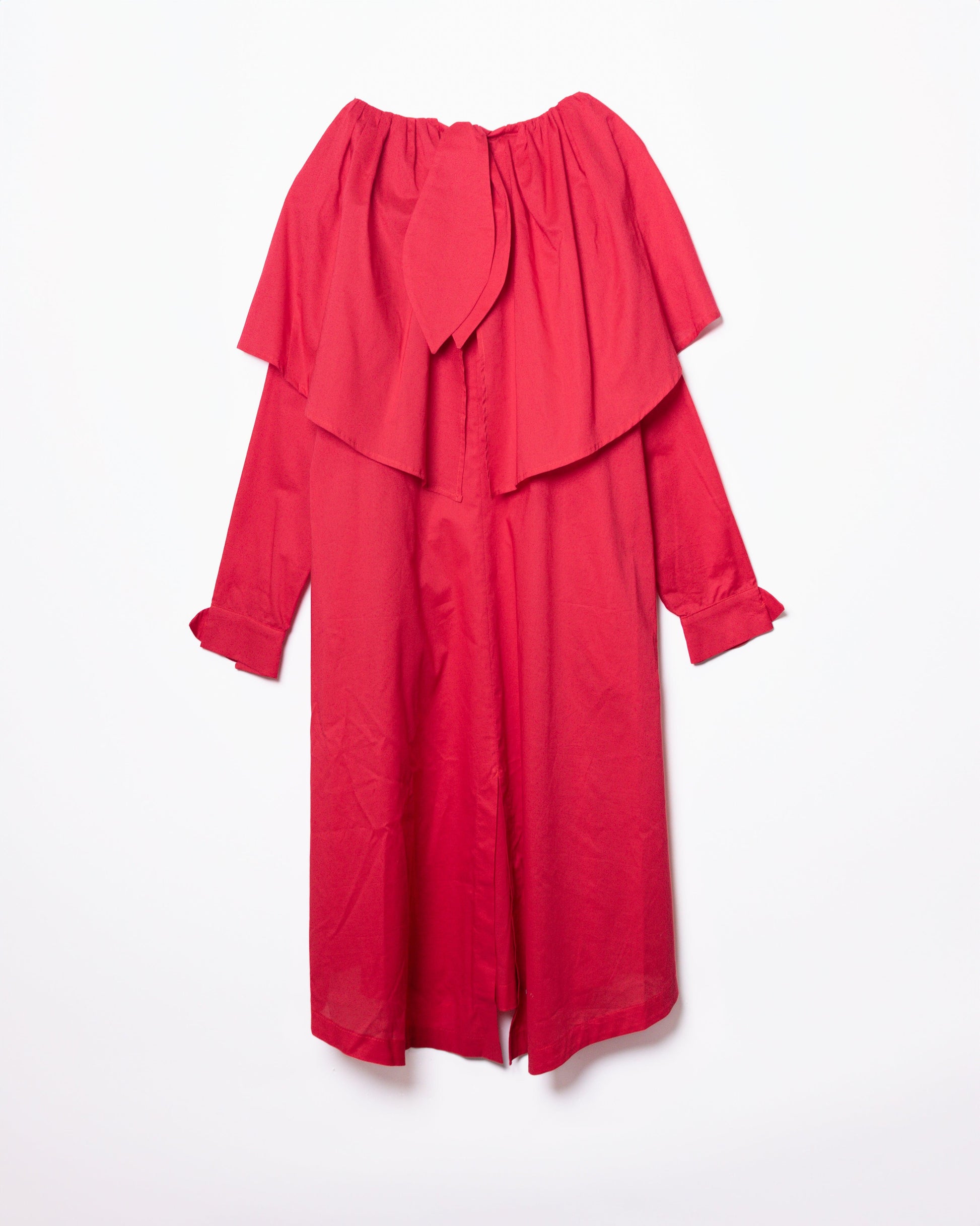 Dress with a midi silhouette, it falls below the knee. Dress with a cape that starts from the neck, and is gathered. It closes with a leaf-shaped bow at the back tear. The coat is shorter in front than in the back. Dress with long sleeves closed with a bow. Low back, with shaped opening. Shaped side sides.