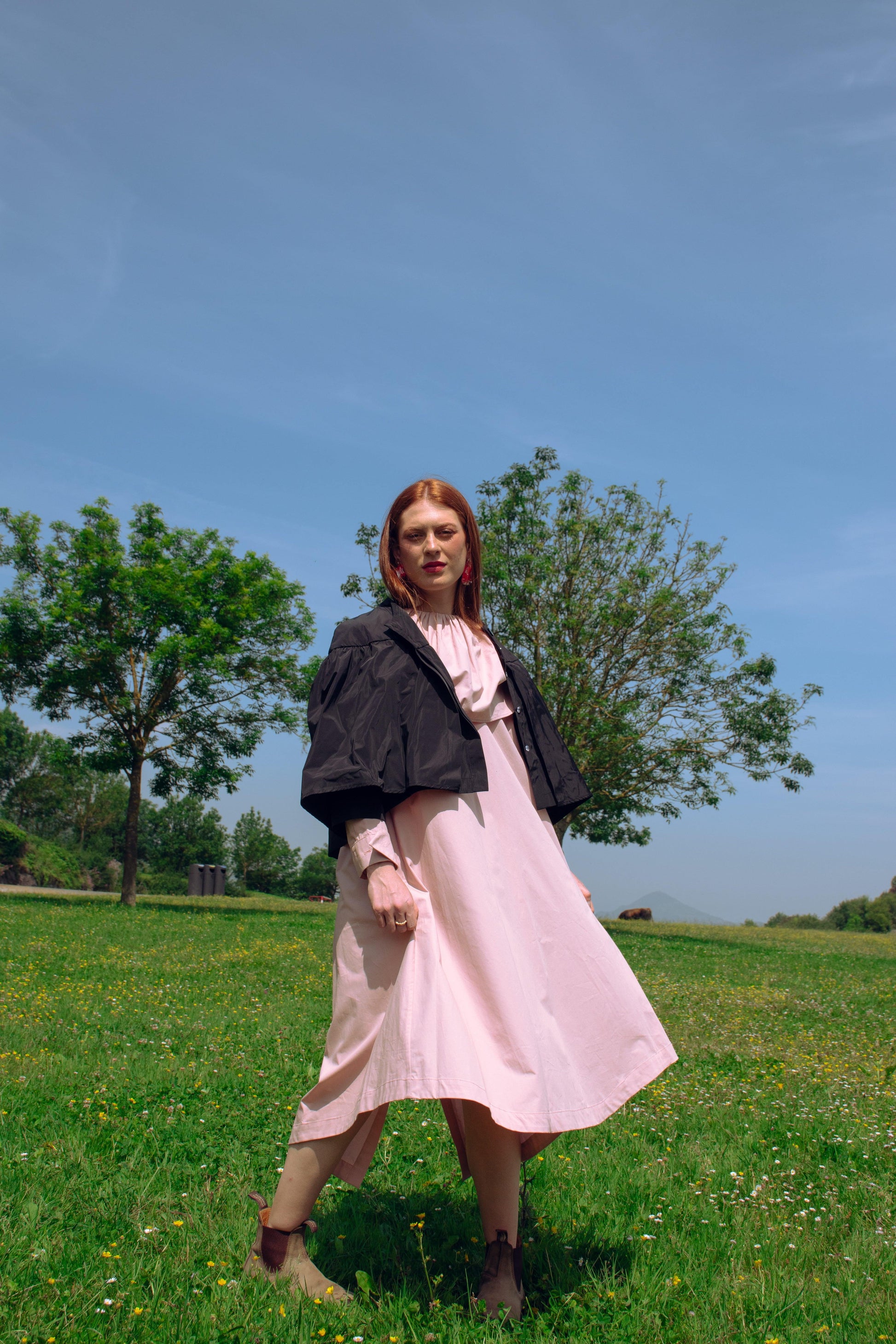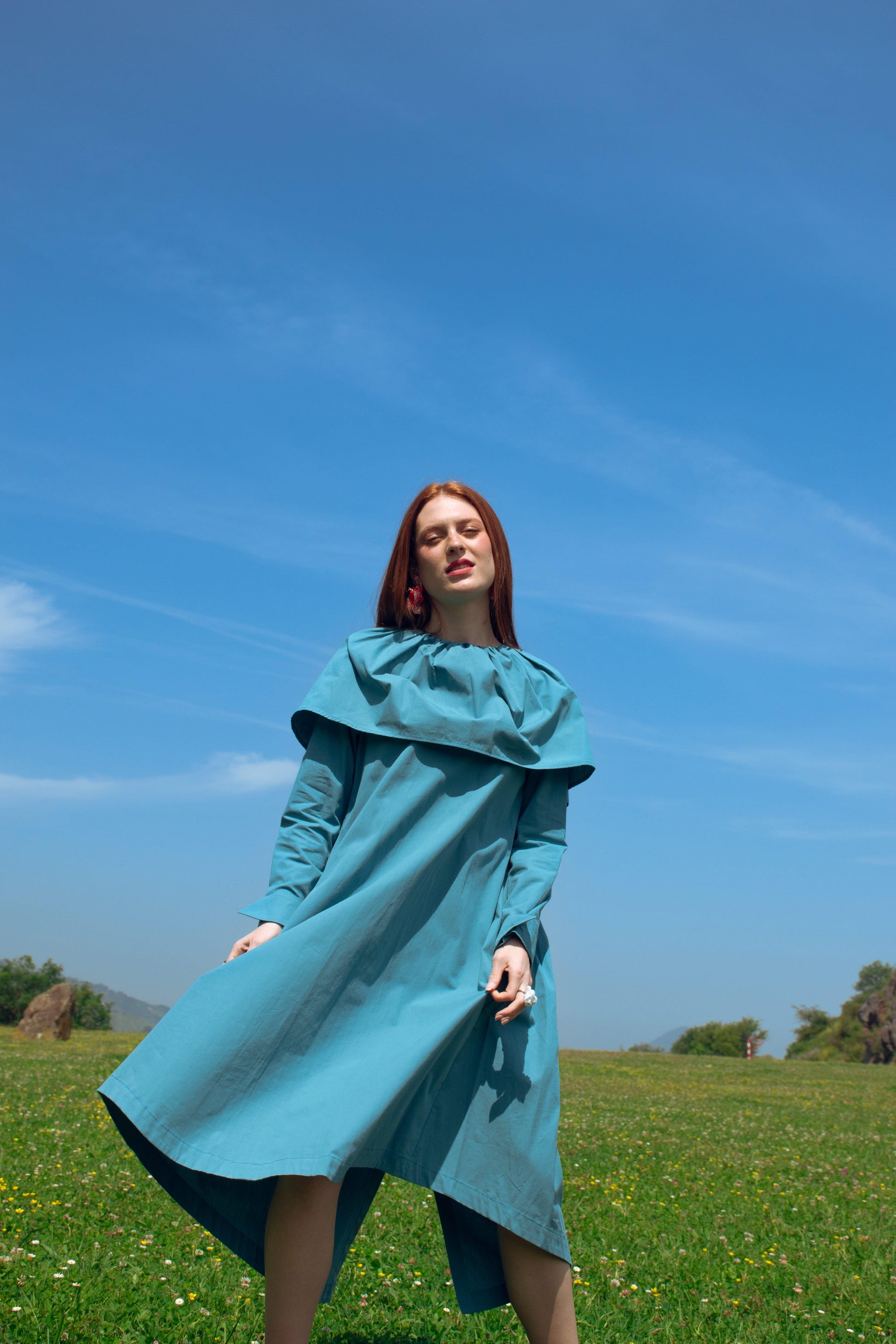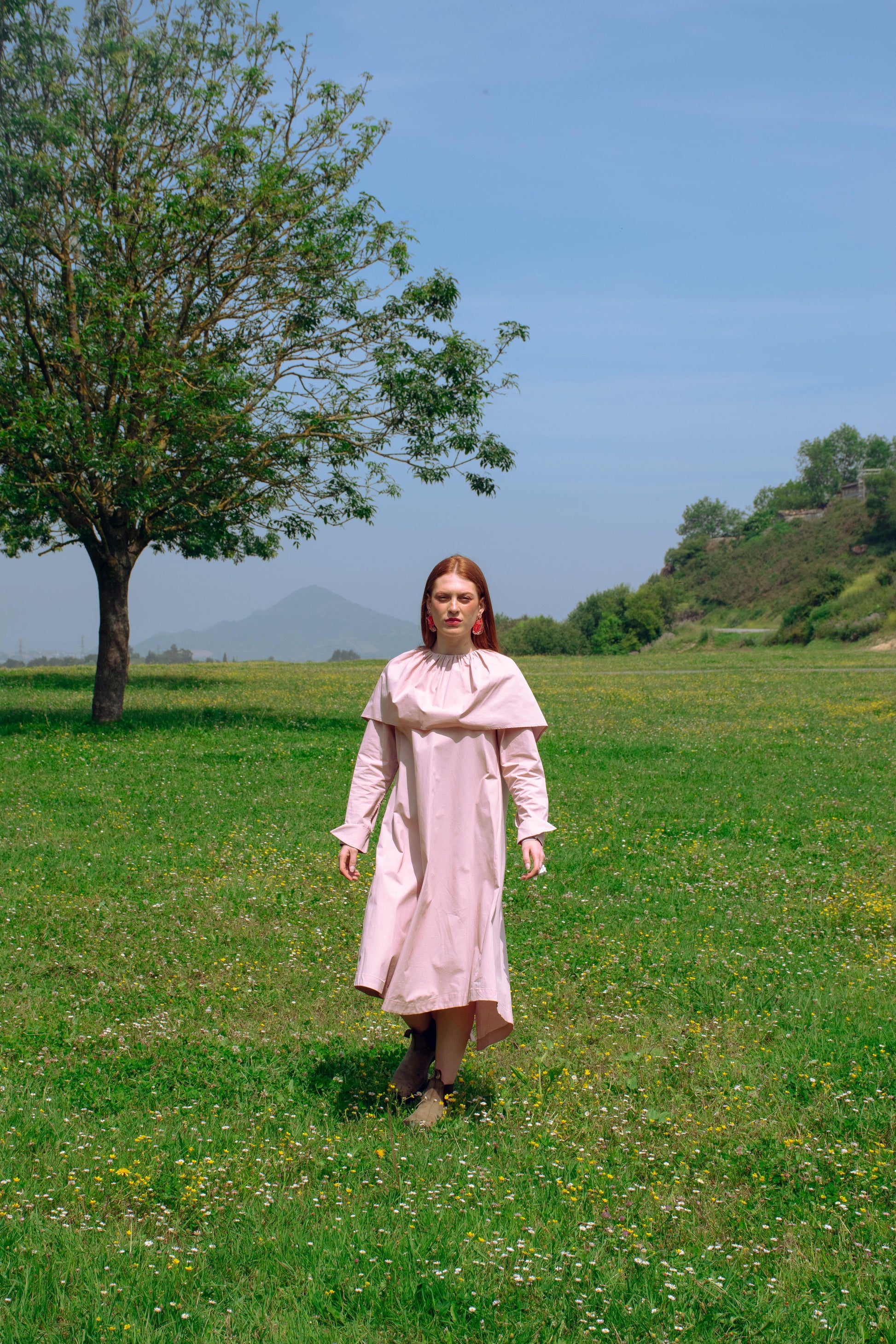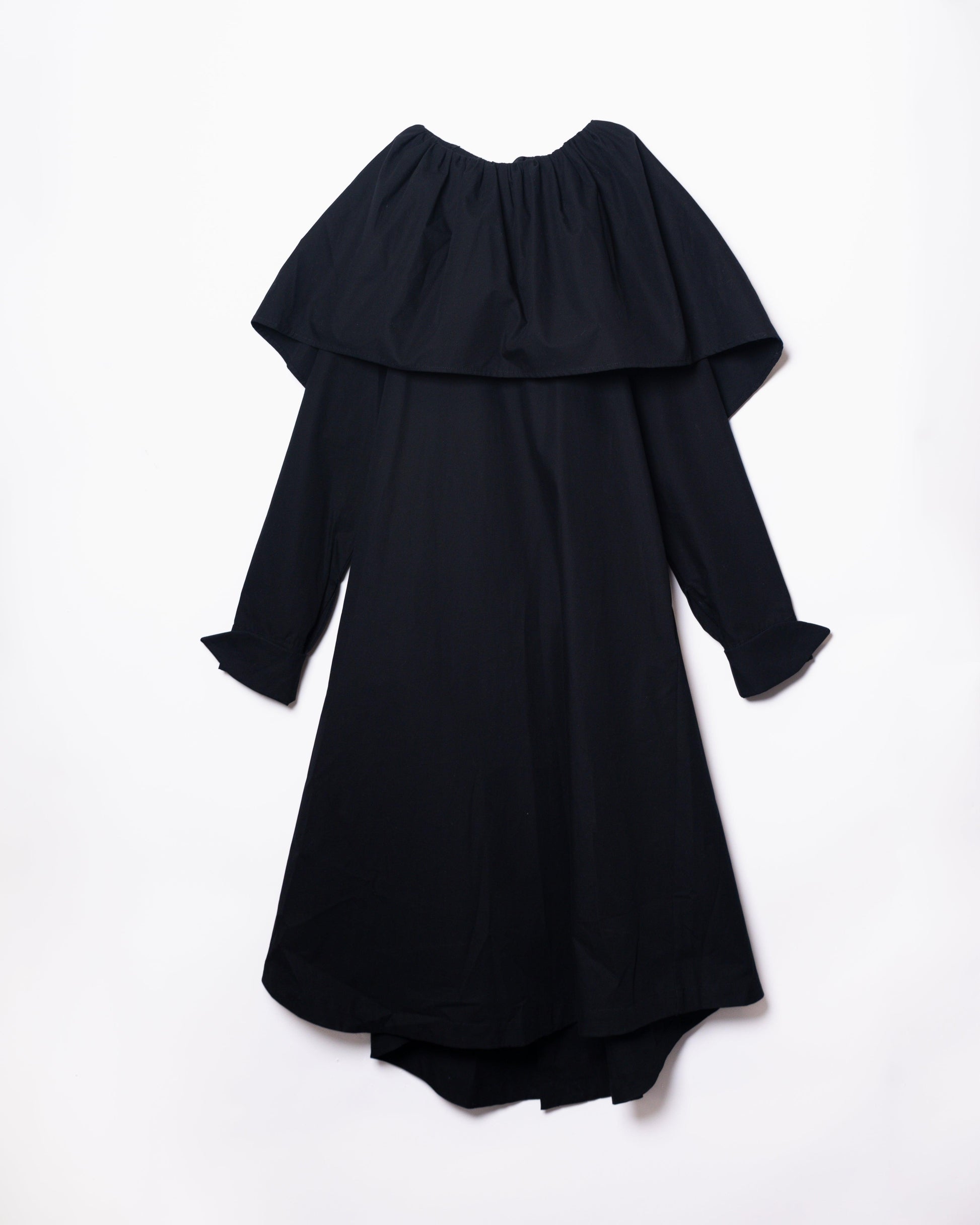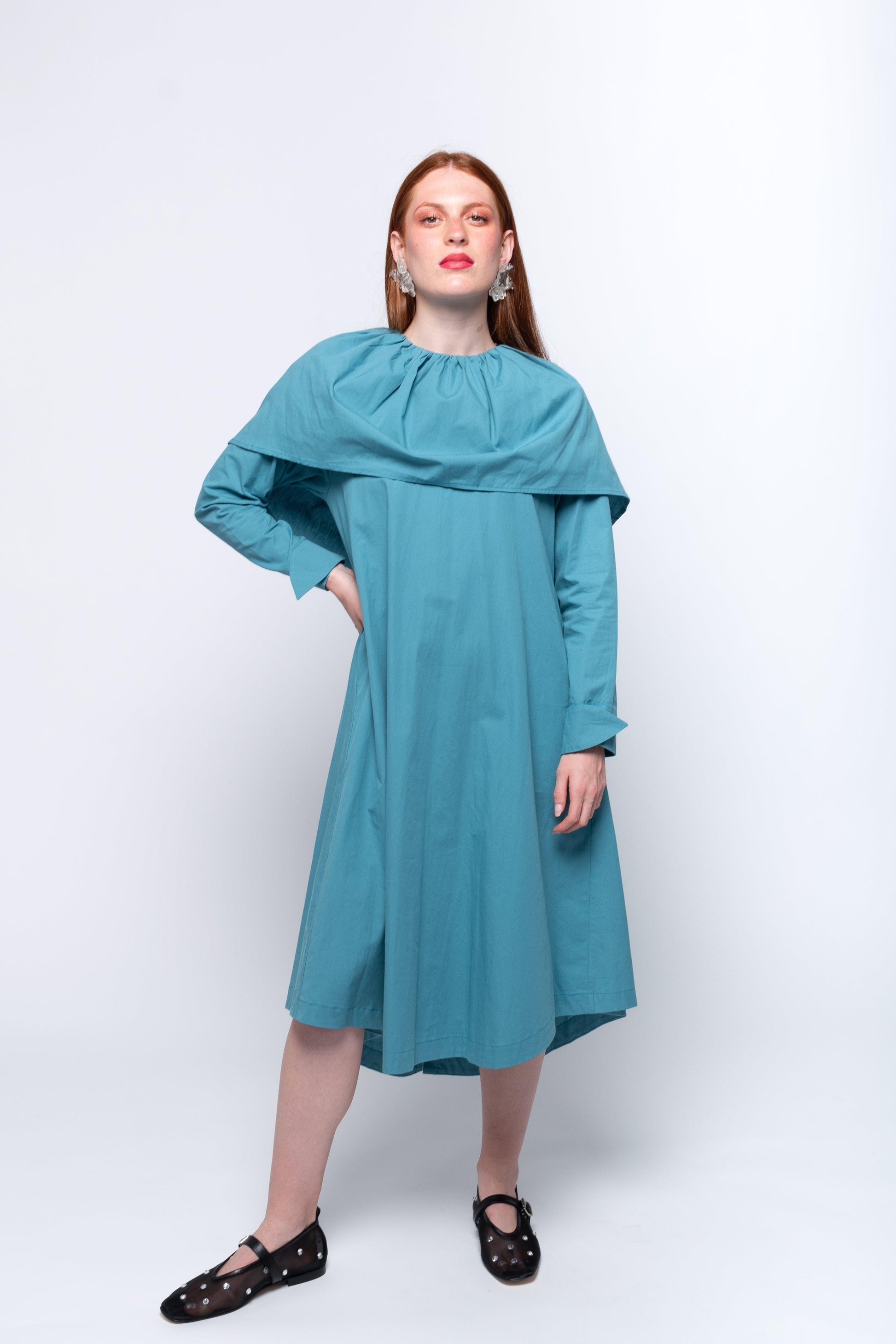 Dress with a midi silhouette, it falls below the knee. Dress with a cape that starts from the neck, and is gathered. It closes with a leaf-shaped bow at the back tear. The coat is shorter in front than in the back. Dress with long sleeves closed with a bow. Low back, with shaped opening. Shaped side sides.