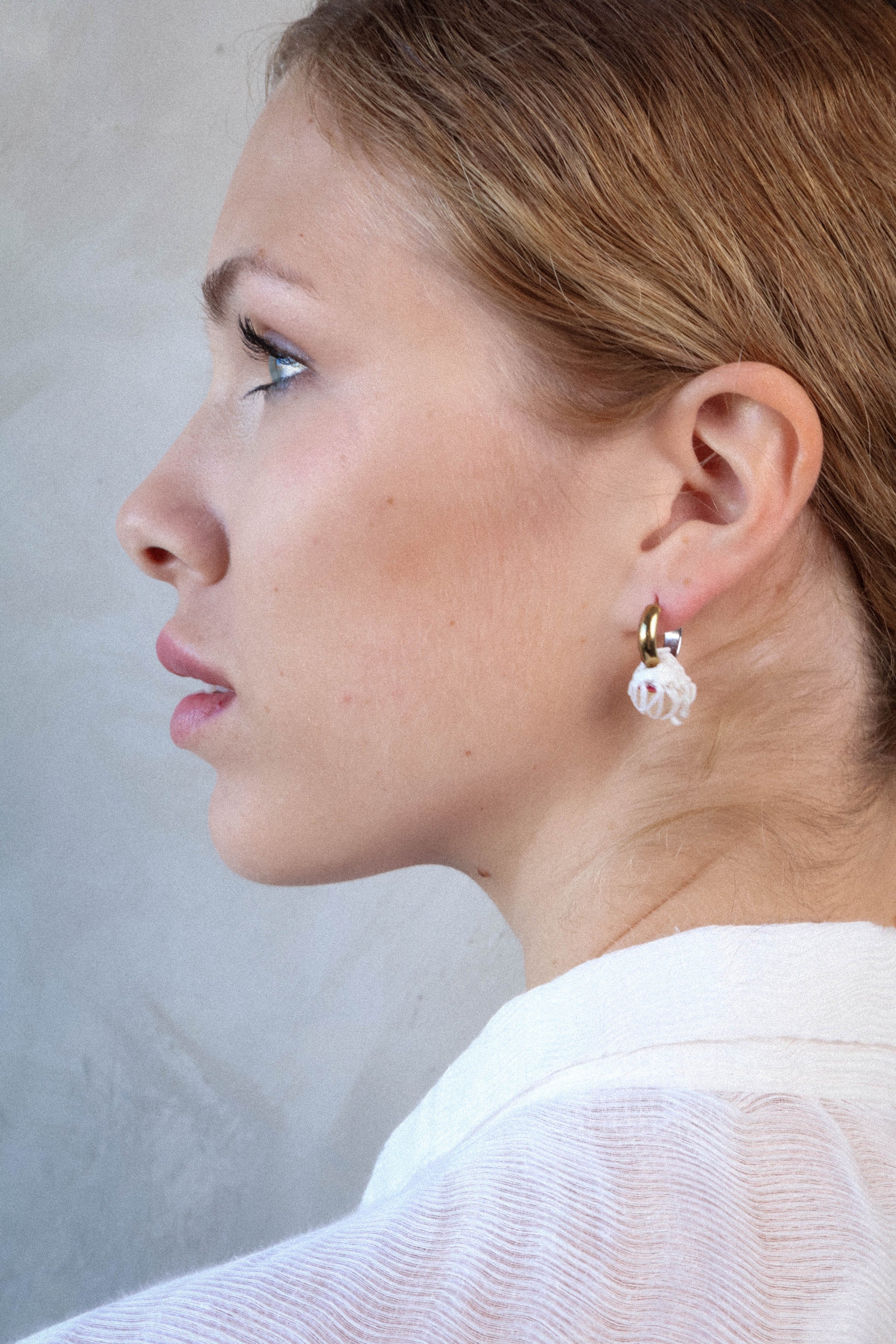 These stainless steel earrings are handcrafted with careful attention to form and organic shape. Each piece is finished with a resin sphere made from 100% PLA fiber, merging artisanal craftsmanship with contemporary design. Size: 15 mm.