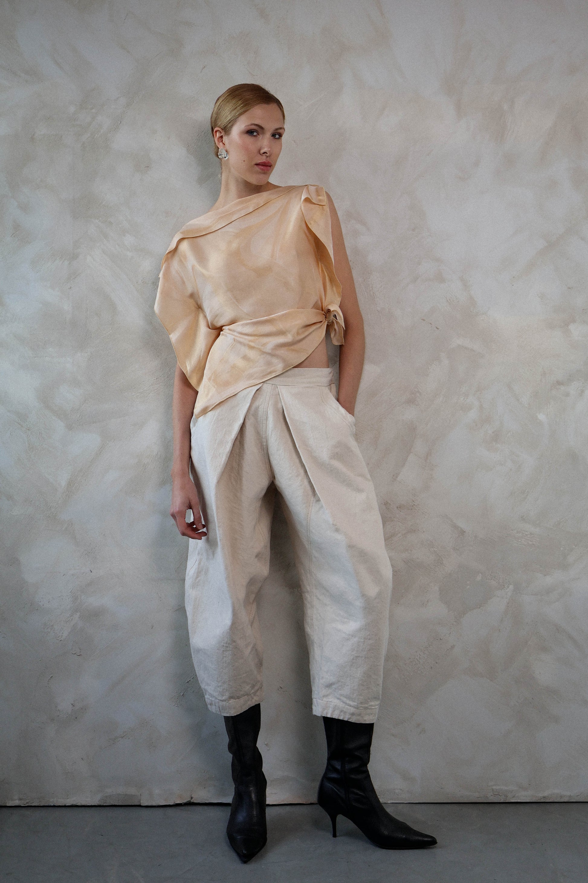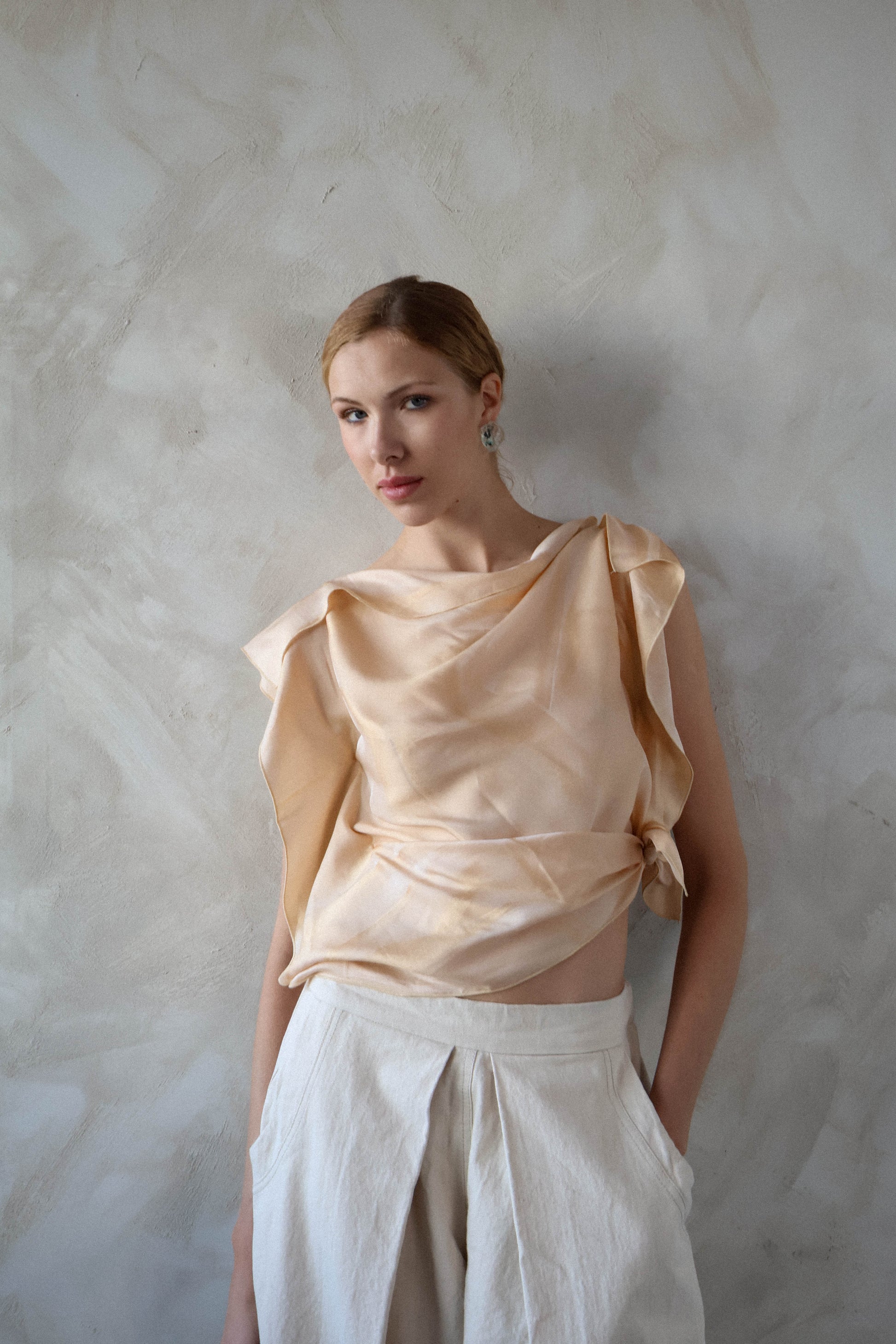 This top is crafted from two scarf-like panels that tie at the side, allowing for versatile styling and creating ever-changing drapes and silhouettes. Its fluid construction blends elegance and movement, offering a unique look each time it is worn.